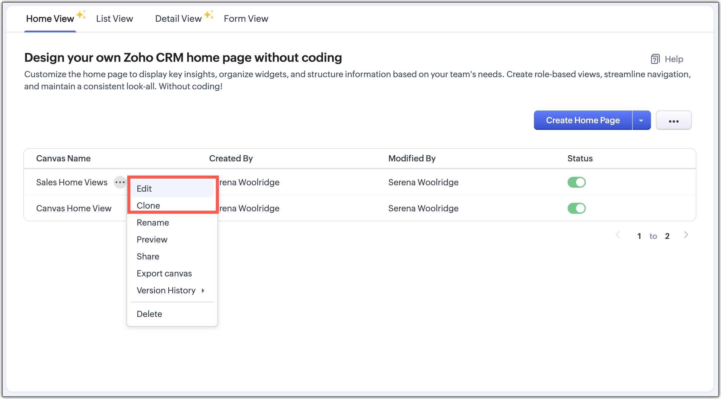 Poți edita un Home View oricând pentru a adăuga sau elimina componente, a schimba layout-uri sau culori și a actualiza acțiuni sau câmpuri obligatorii. Poți de asemenea clona o vizualizare și o poți reutiliza dacă este necesar.