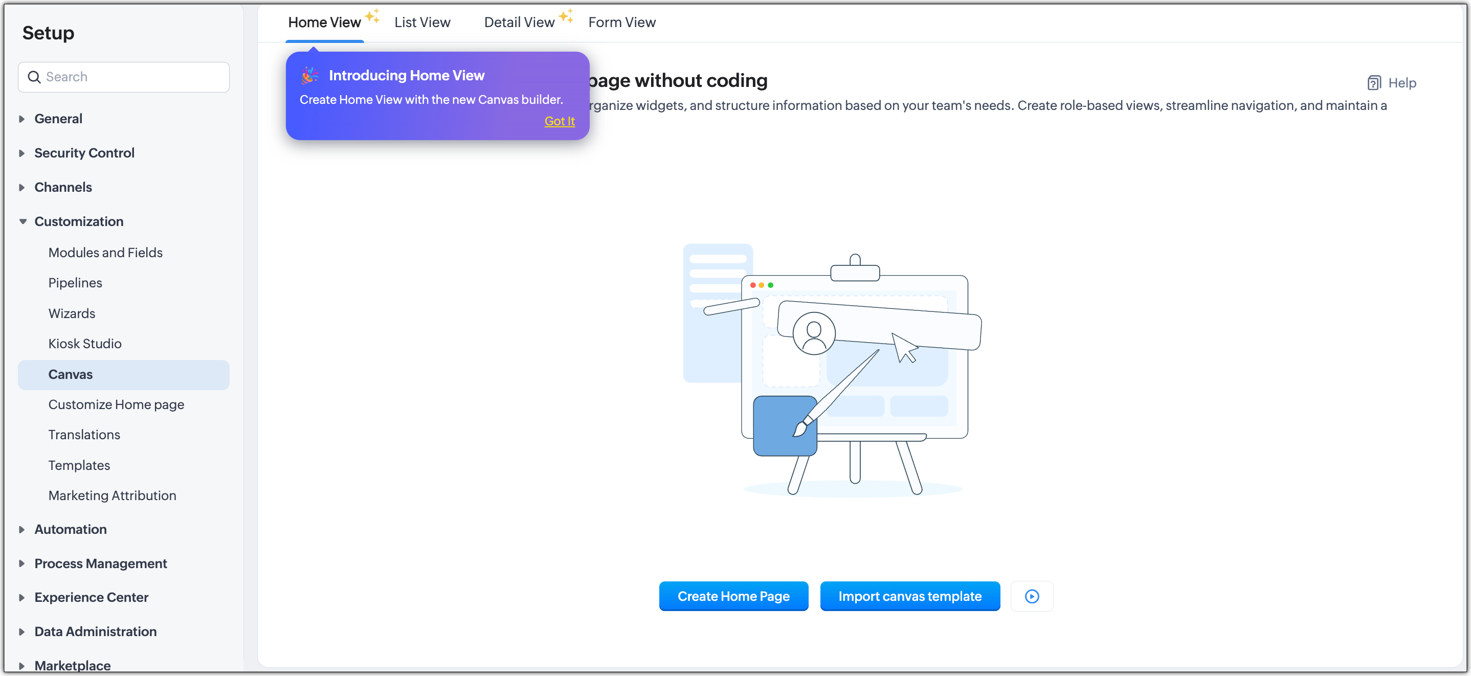 Gestionarea Canvas Home View