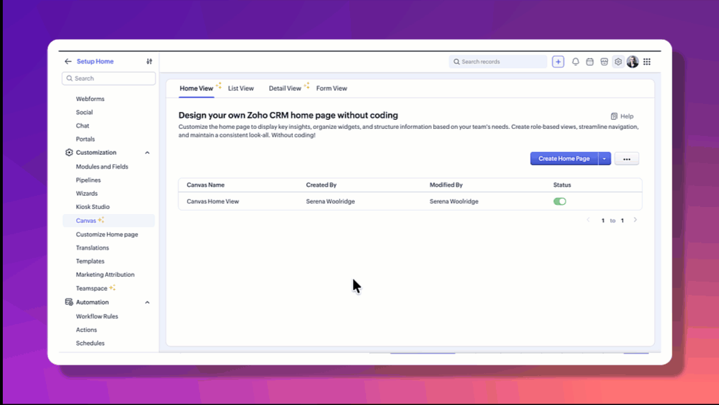 Canvas Home View se aplică doar paginii de start din CRM și nu afectează datele sau înregistrările din module.