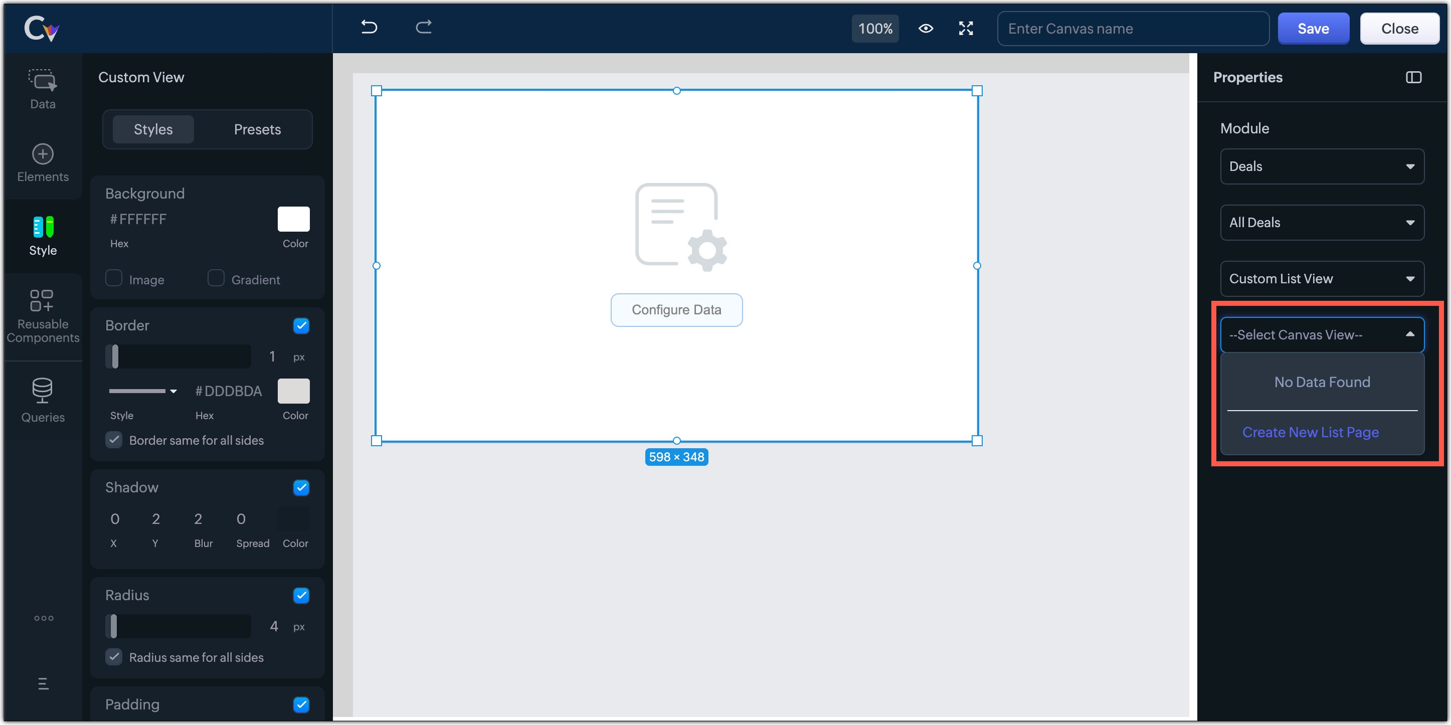 Dacă un modul nu are deja o vizualizare de liste personalizată, poți crea una și apoi să o adaugi în Home View. Dacă nu ai creat nicio vizualizare de liste în canvas, poți crea o Nouă Pagină de Liste din secțiunea de proprietăți a constructorului canvas, astfel încât să poată fi încorporată în orice componentă a Home View.