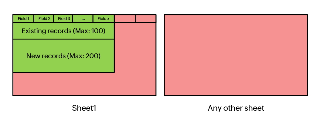 - Poți adăuga maximum 200 de rânduri noi în Sheet View (pe lângă cele 100 de rânduri menționate mai sus). Salvează-le pentru a crea înregistrări noi. Pentru a adăuga mai multe rânduri, va trebui să închizi Sheet View-ul existent, să deschizi din nou un sheet view și apoi să adaugi intrările noi. Dacă datele sunt introduse în afara coloanelor predefinite și/sau dincolo de numărul maxim de rânduri, acestea nu vor fi salvate. În diagrama de mai jos, datele introduse în zona marcată cu verde vor fi salvate, în timp ce cele introduse în orice alt loc (marcat cu roșu) vor fi ignorate.
