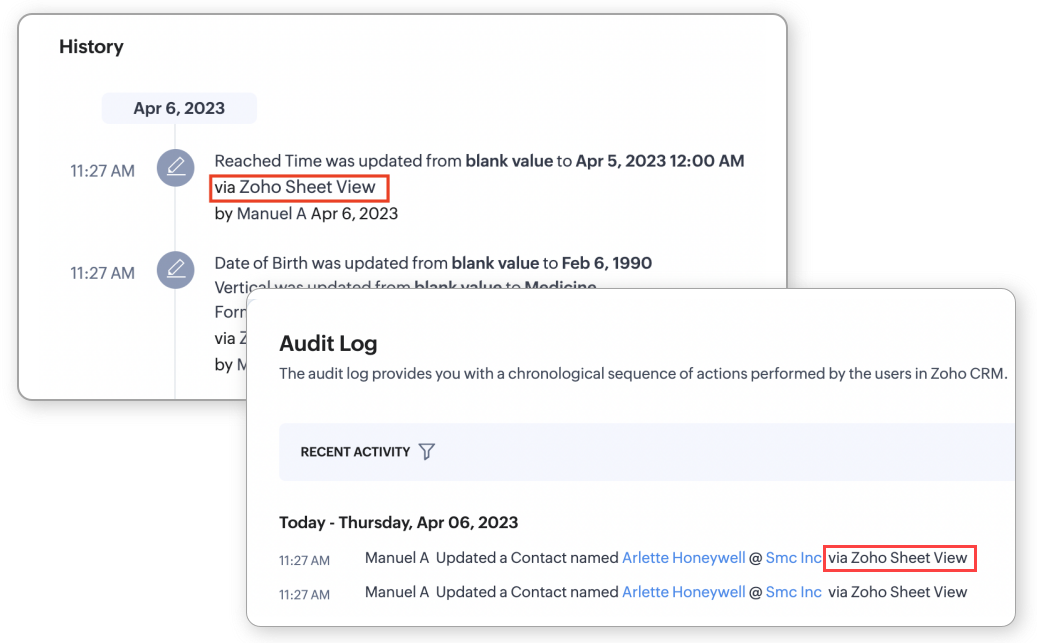 - Intrările sunt adăugate în Timeline și Audit Log pentru modificările făcute prin Zoho Sheet View