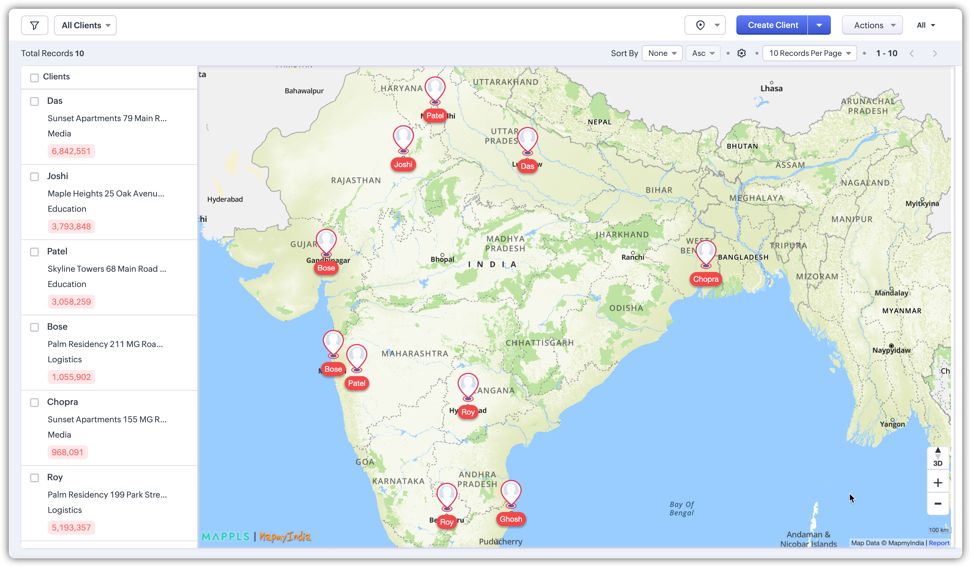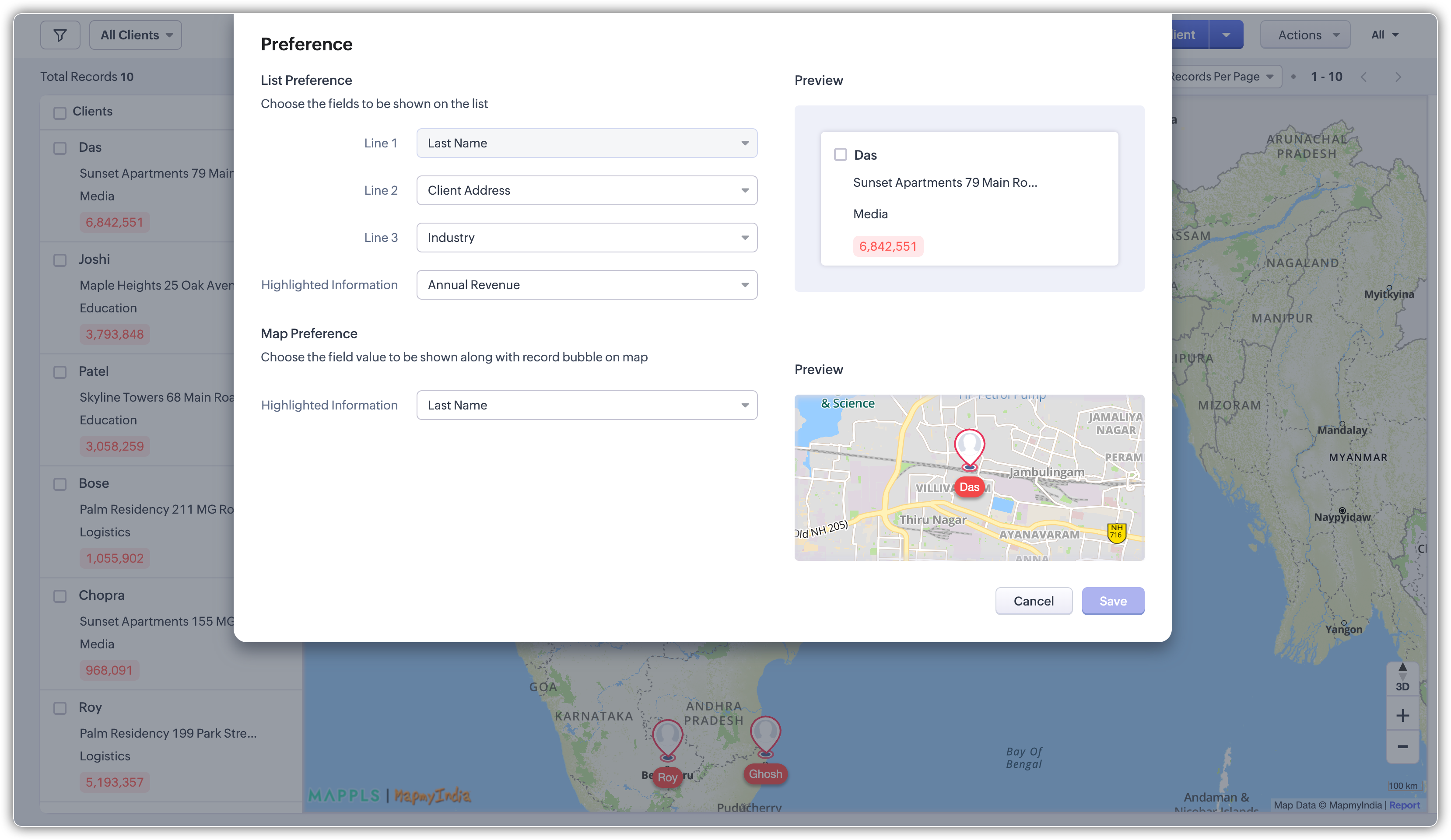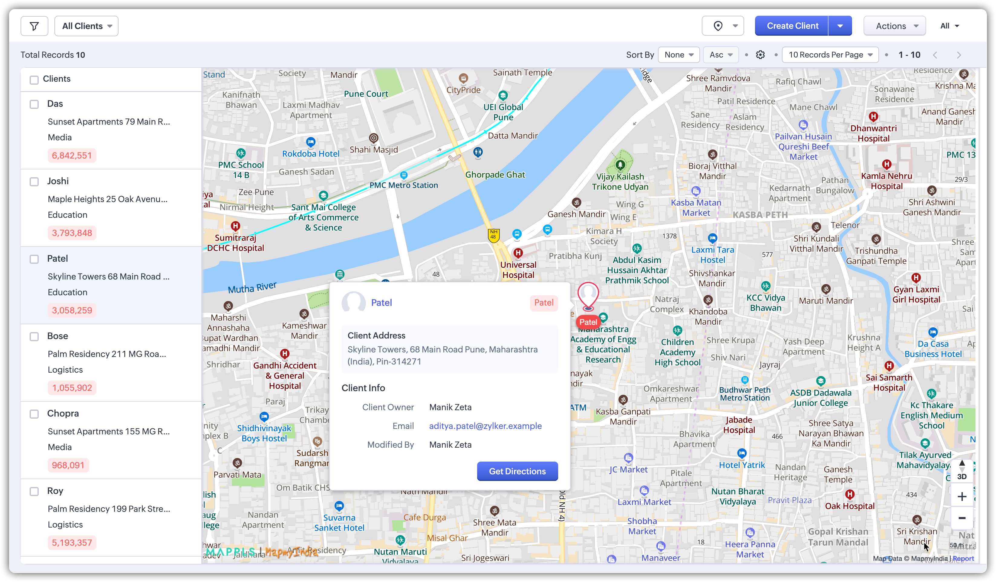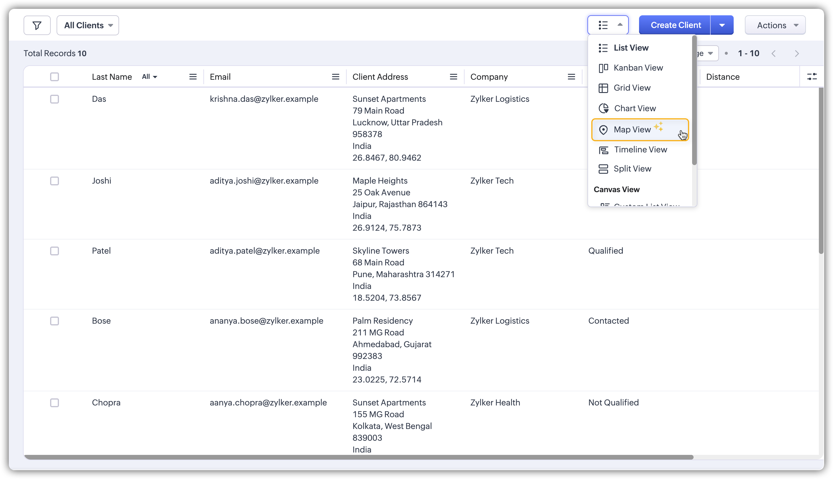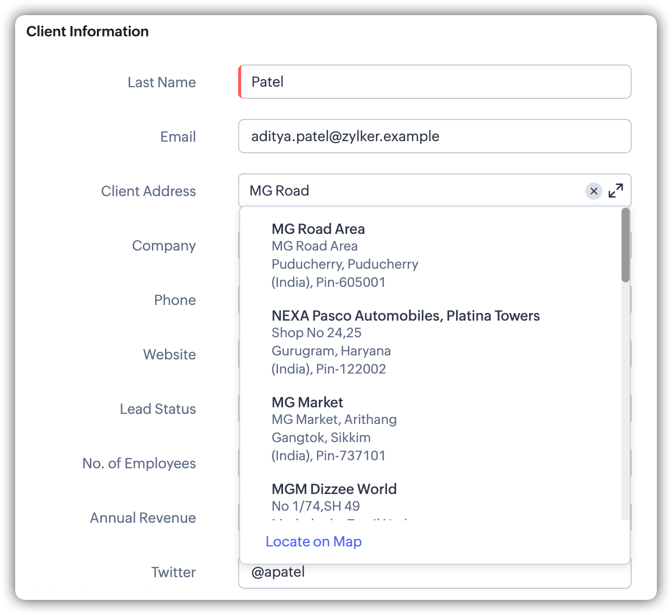 - Integrare cu MapMyIndia: Vizualizarea hartă și sugestiile de adrese din Zoho CRM sunt alimentate de MapMyIndia. Când introduci o adresă în câmpurile de adresă, informațiile sunt trimise către MapMyIndia pentru a permite auto-sugestii. Cu toate acestea, este important de reținut că MapMyIndia nu păstrează nicio referință la înregistrarea specifică din CRM și nu accesează date detaliate din înregistrările tale.