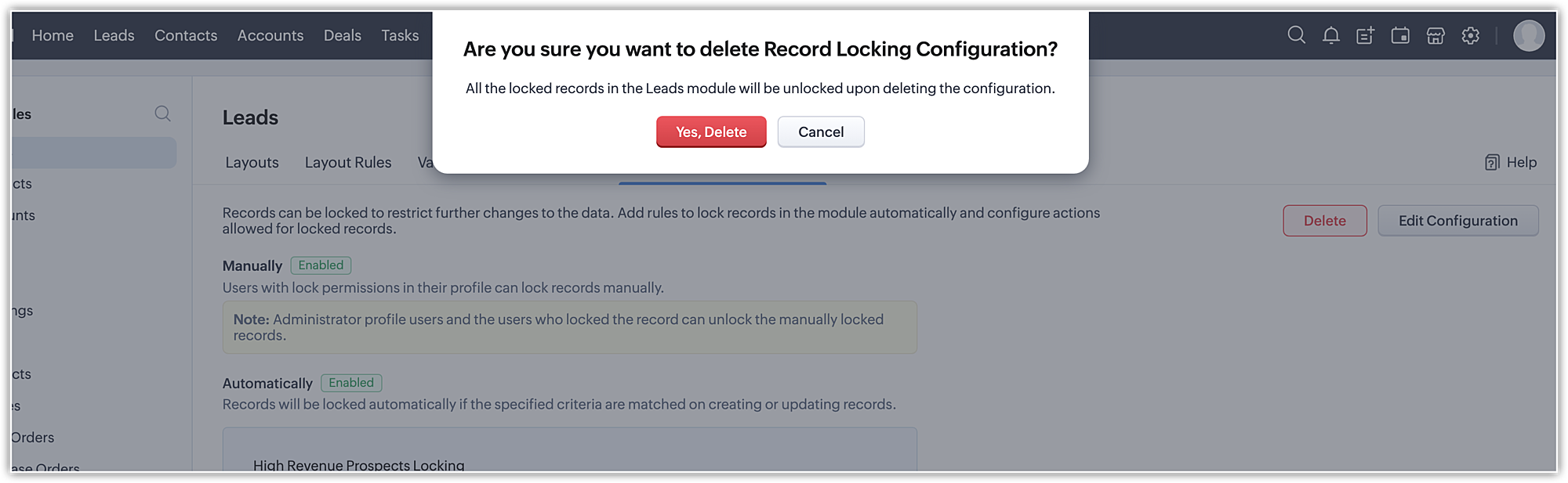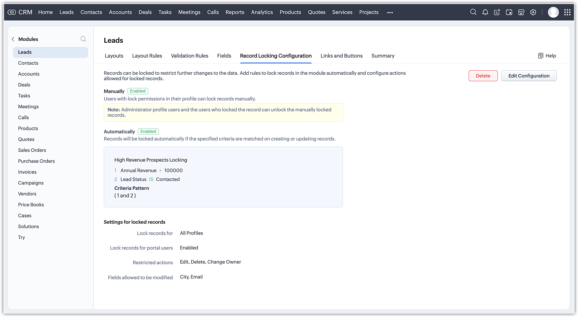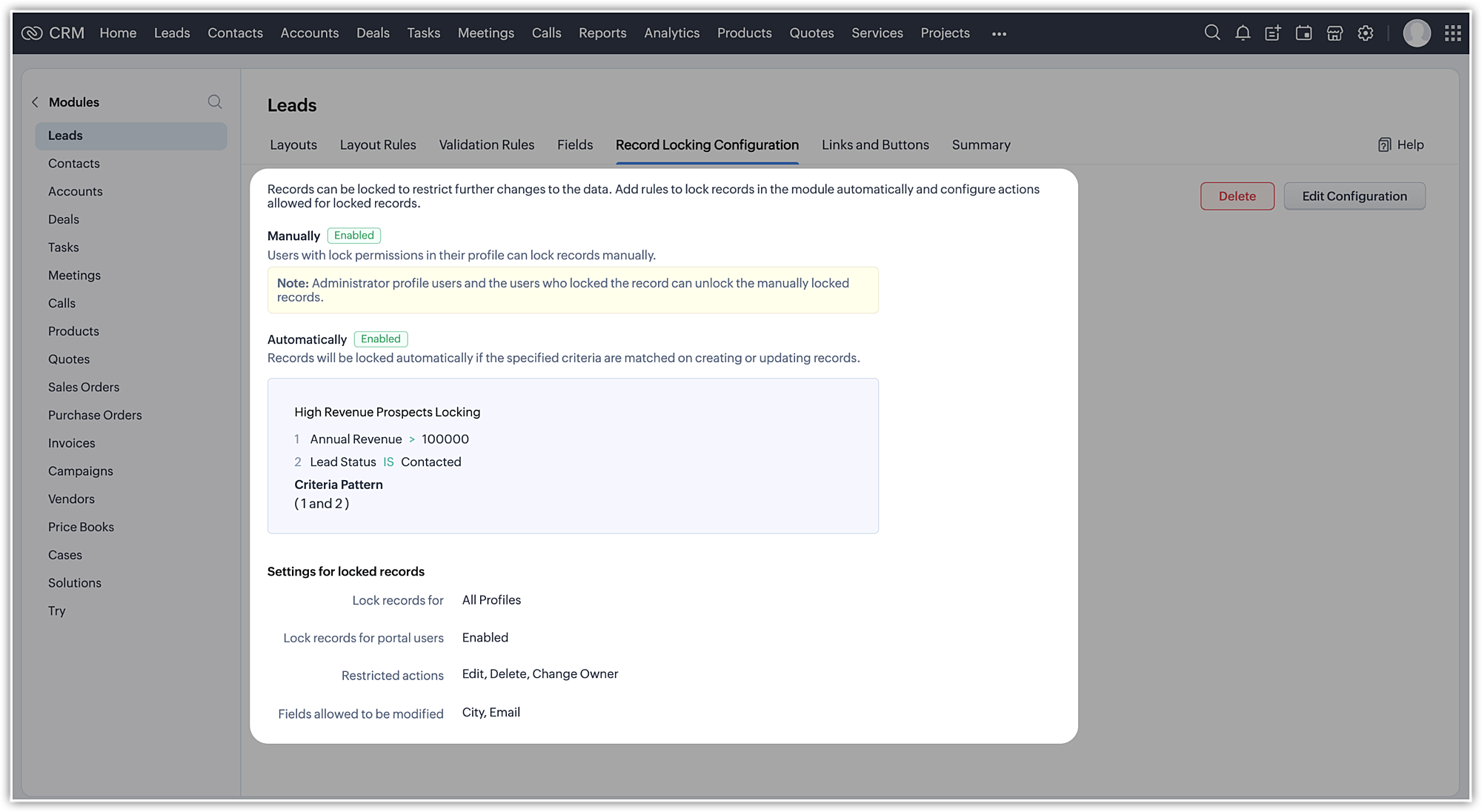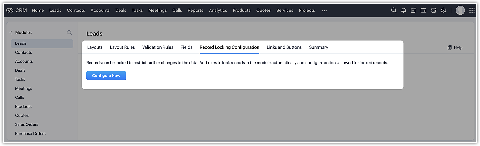 Anumite scenarii de business necesită ca înregistrările din modulele organizației tale să fie restricționate de la editare sau ștergere odată ce ajung la o anumită etapă în procesul de vânzări sau îndeplinesc o condiție specifică. Blocarea înregistrărilor este o configurație care îți permite să blochezi acele înregistrări manual sau automat atunci când sunt îndeplinite anumite condiții.