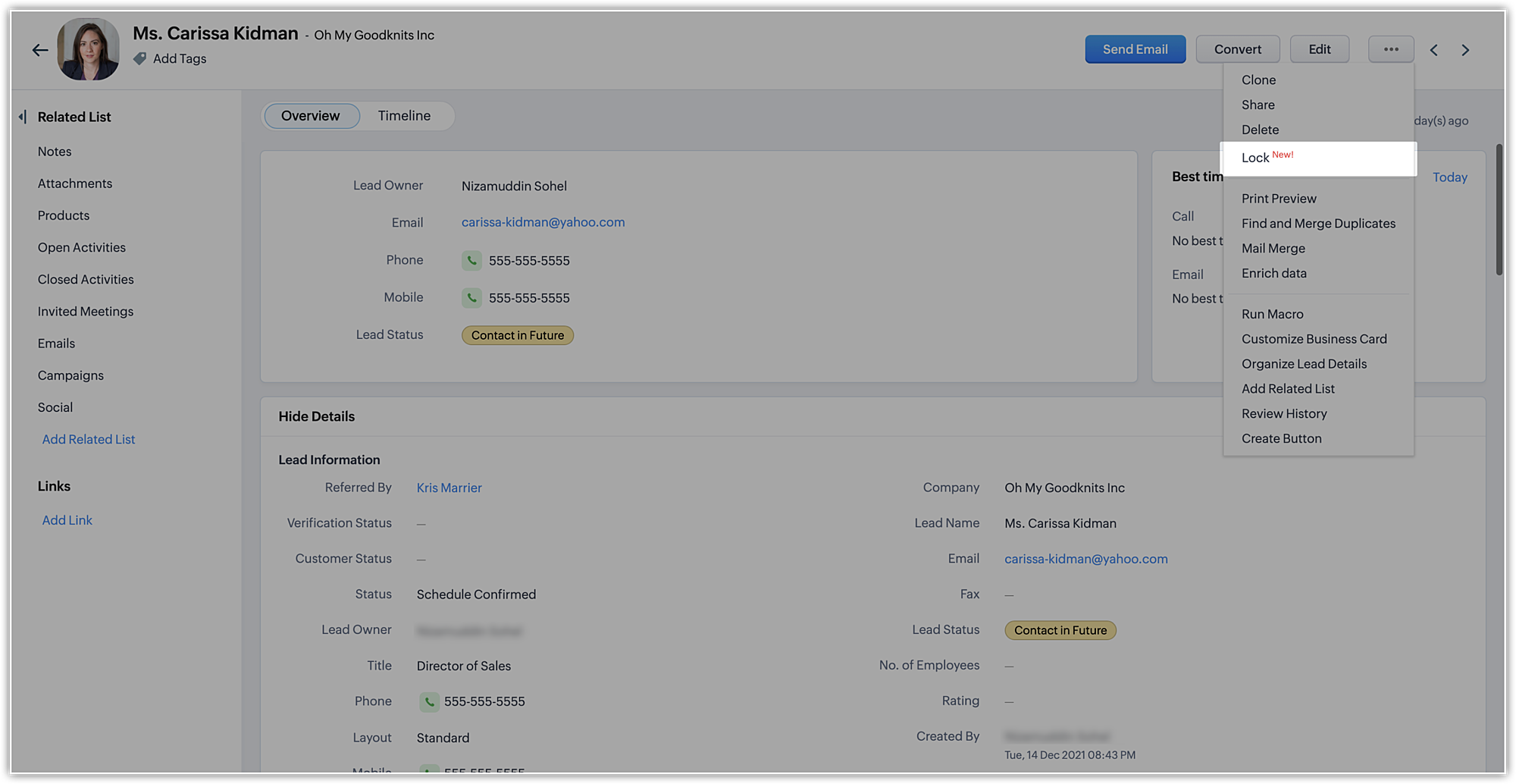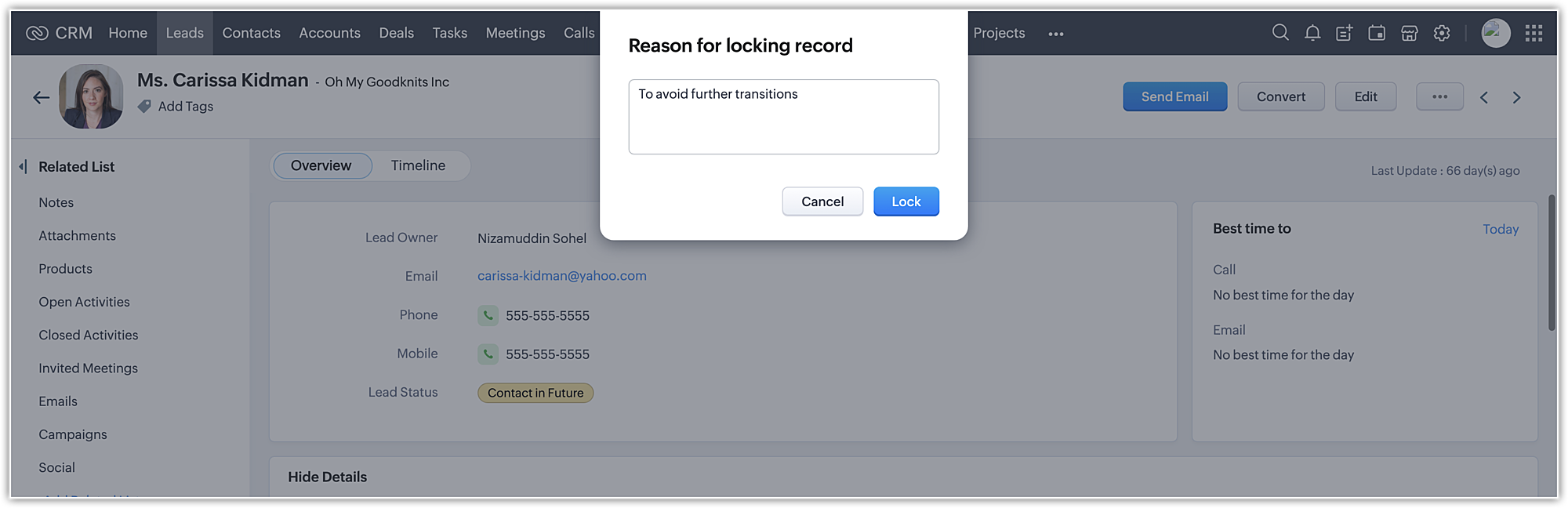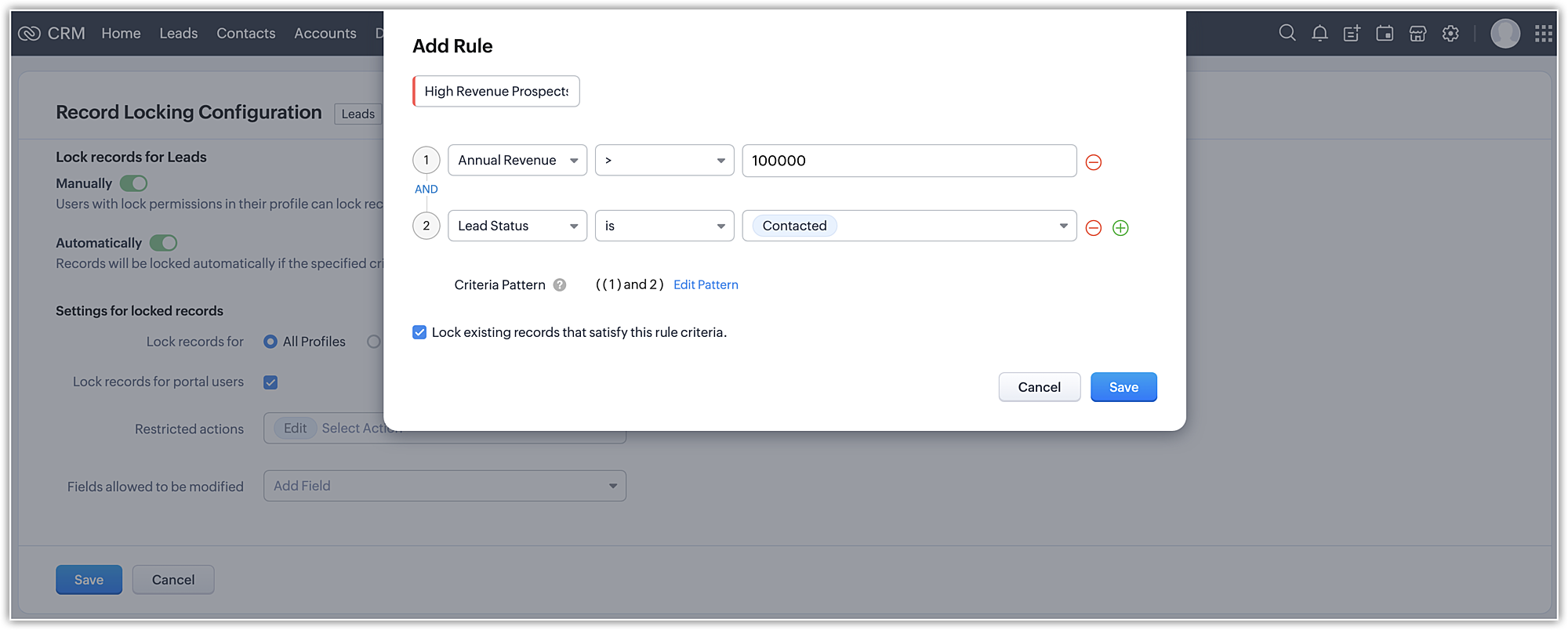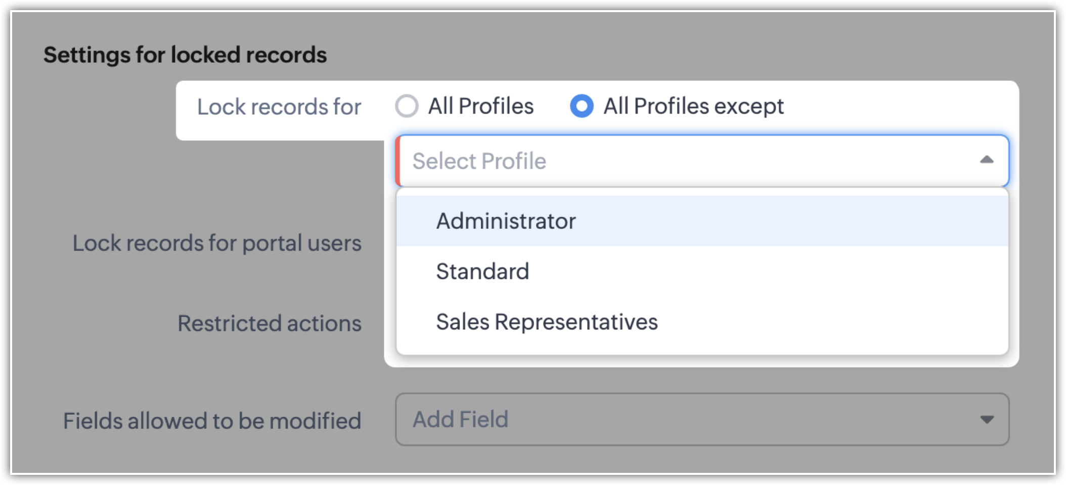 Anumite scenarii de business necesită ca înregistrările din modulele organizației tale să fie restricționate de la editare sau ștergere odată ce ajung la o anumită etapă în procesul de vânzări sau îndeplinesc o condiție specifică. Blocarea înregistrărilor este o configurație care îți permite să blochezi acele înregistrări manual sau automat atunci când sunt îndeplinite anumite condiții.
