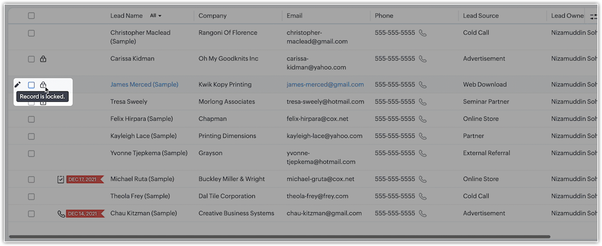 - Vizualizare listă: În vizualizarea listă, înregistrările blocate vor fi afișate cu o pictogramă de blocare.