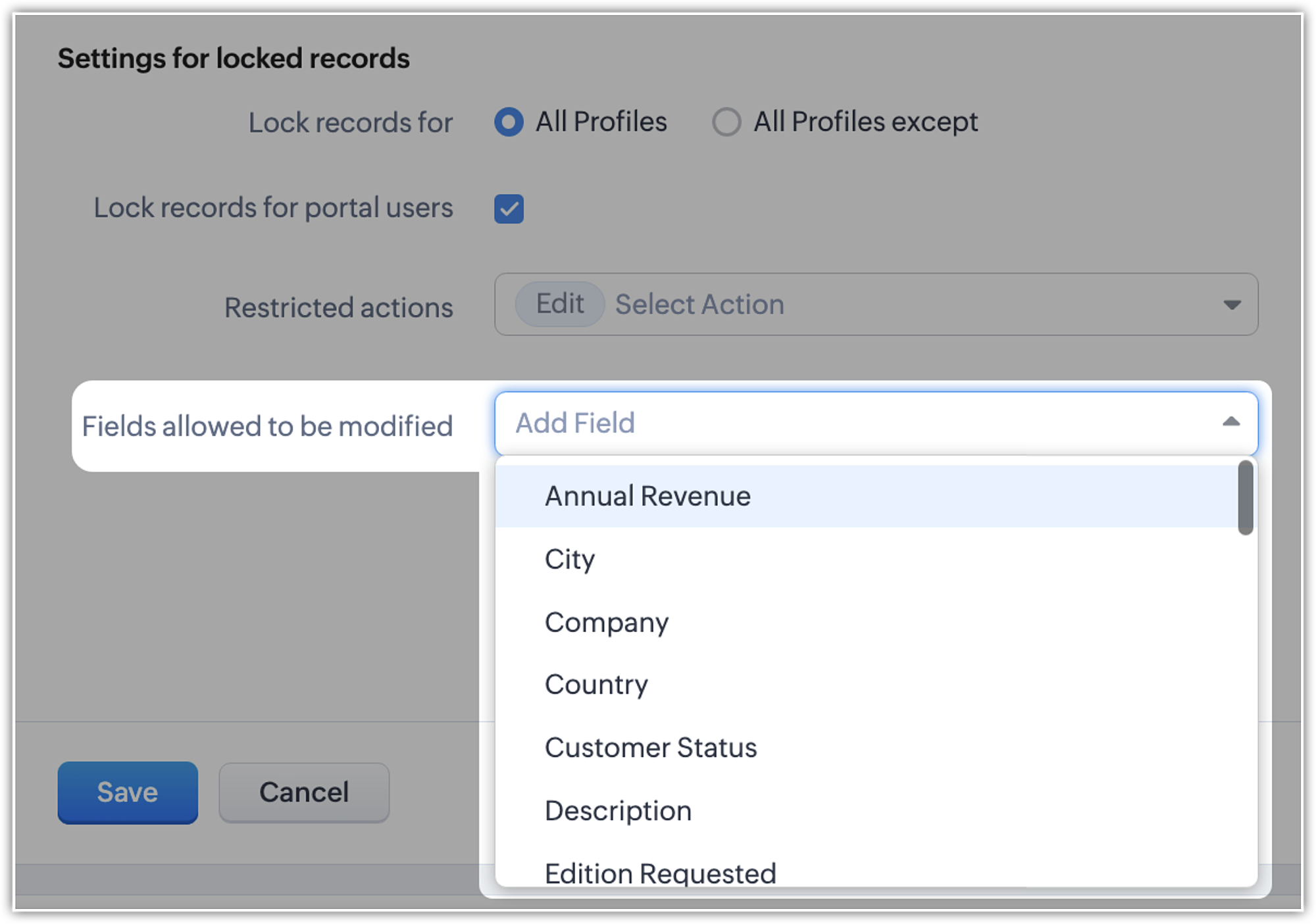 Cu toate acestea, chiar și când înregistrarea este blocată, câteva câmpuri care nu afectează procesul de business pot fi lăsate editabile. De exemplu, în cazul tranzacțiilor închise, câmpul Descriere sau câmpurile de Comentarii pot fi lăsate editabile