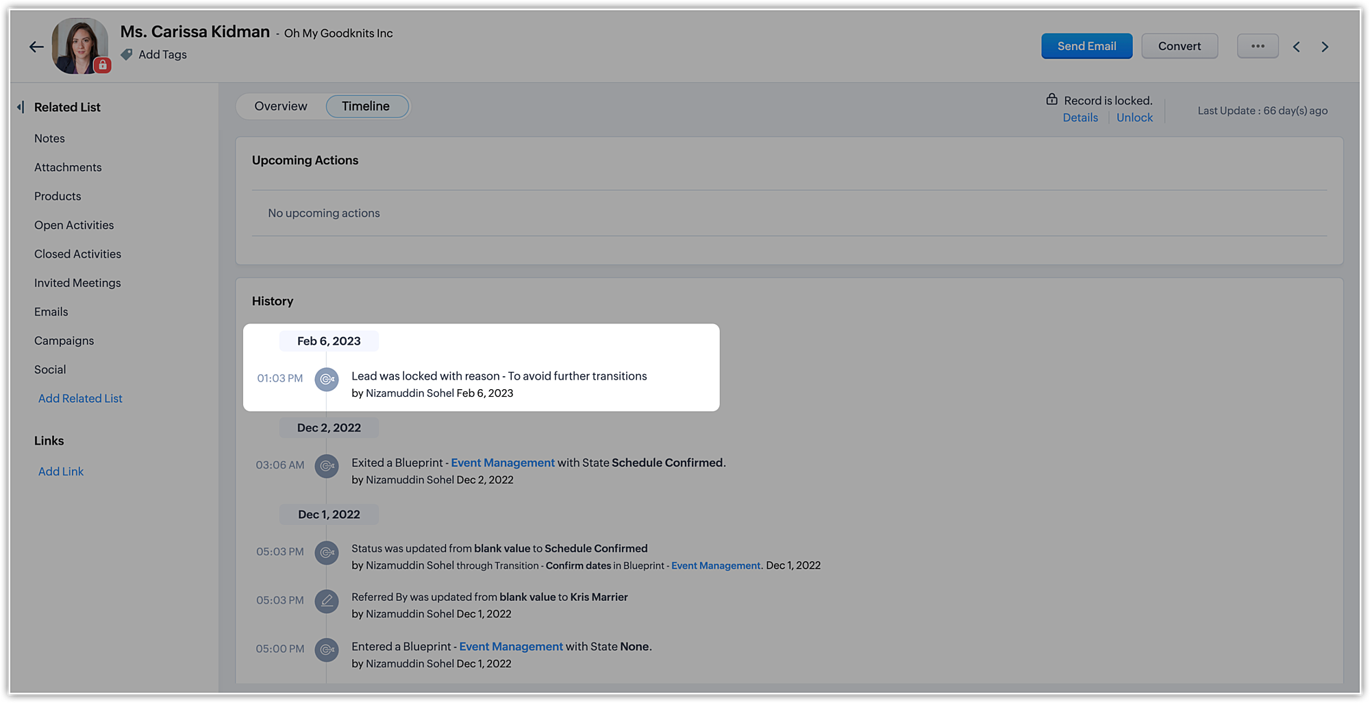 - Când o organizație este retrogradată la ediții inferioare ale Zoho CRM, înregistrările blocate vor fi deblocate automat; starea de blocare nu poate fi recuperată la upgrade.