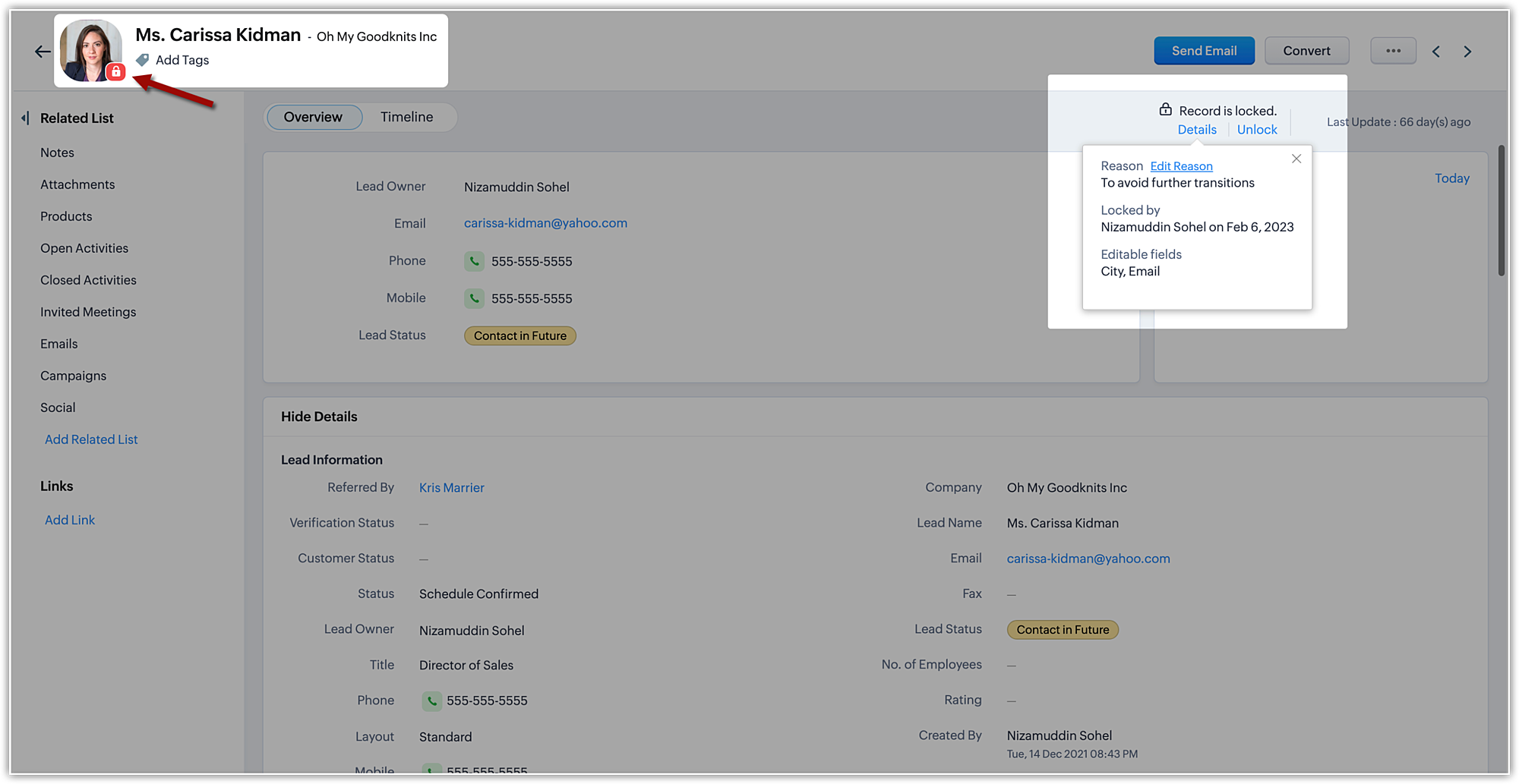 Odată ce o înregistrare este blocată, pictograma de blocare va apărea pe imaginea înregistrării sau lângă numele înregistrării. Doar câmpurile permise vor fi disponibile pentru editare. Detaliile blocării, cum ar fi motivul (adică condiția de blocare), data blocării și câmpurile disponibile pentru editare vor fi afișate pe butonul de detalii.