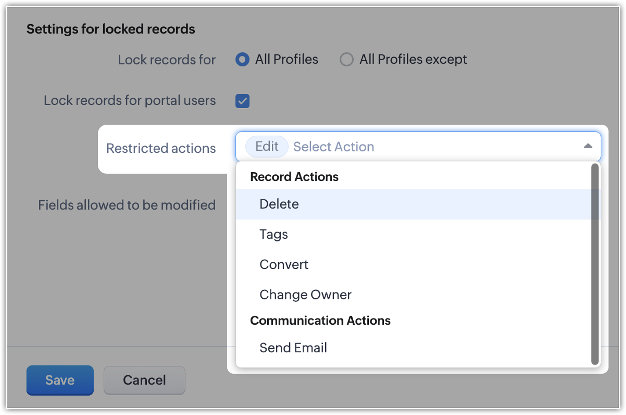 - Poți selecta acțiunile care vor fi restricționate pentru înregistrări. Opțiunea de Editare este restricționată implicit.