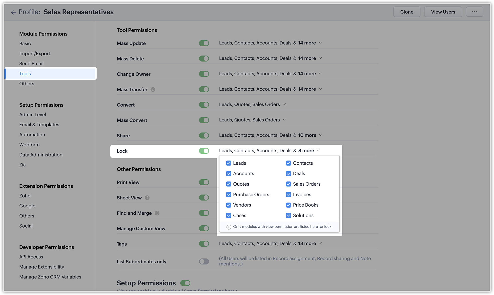 Permisiunea de profil va fi disponibilă în Tools sub Module Permissions. La activarea acesteia pentru un profil, administratorul poate selecta modulele pentru care profilul poate bloca.