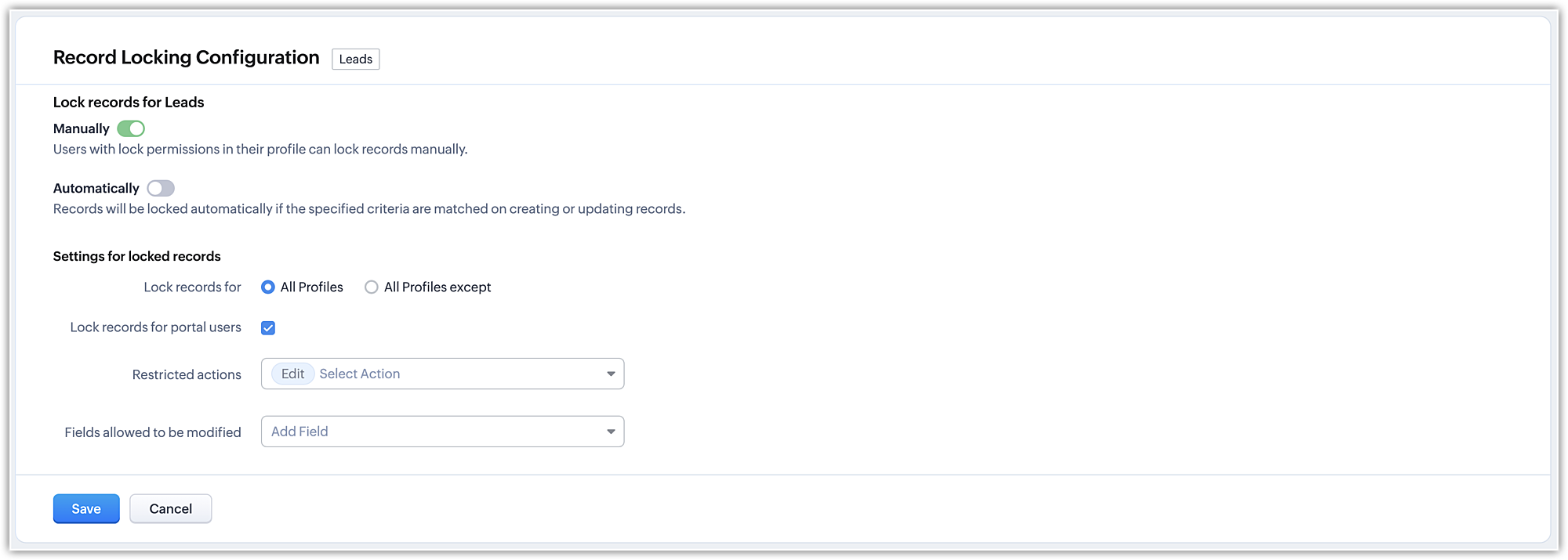 - Comută Manually pentru a activa sau dezactiva blocarea manuală a înregistrărilor de către utilizatorii cu permisiune de blocare.