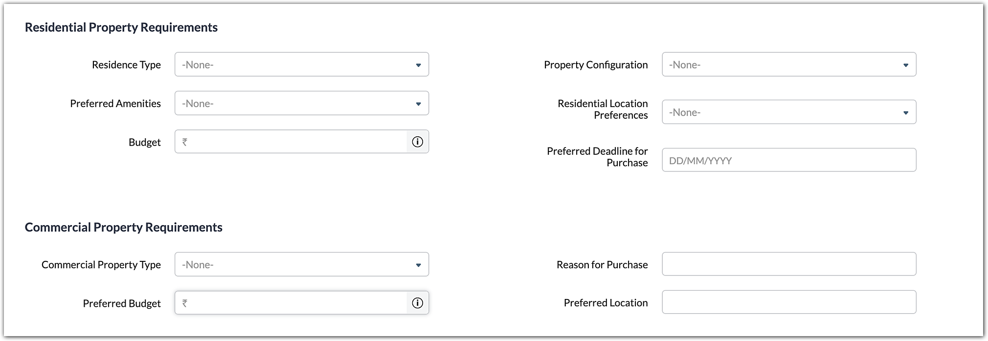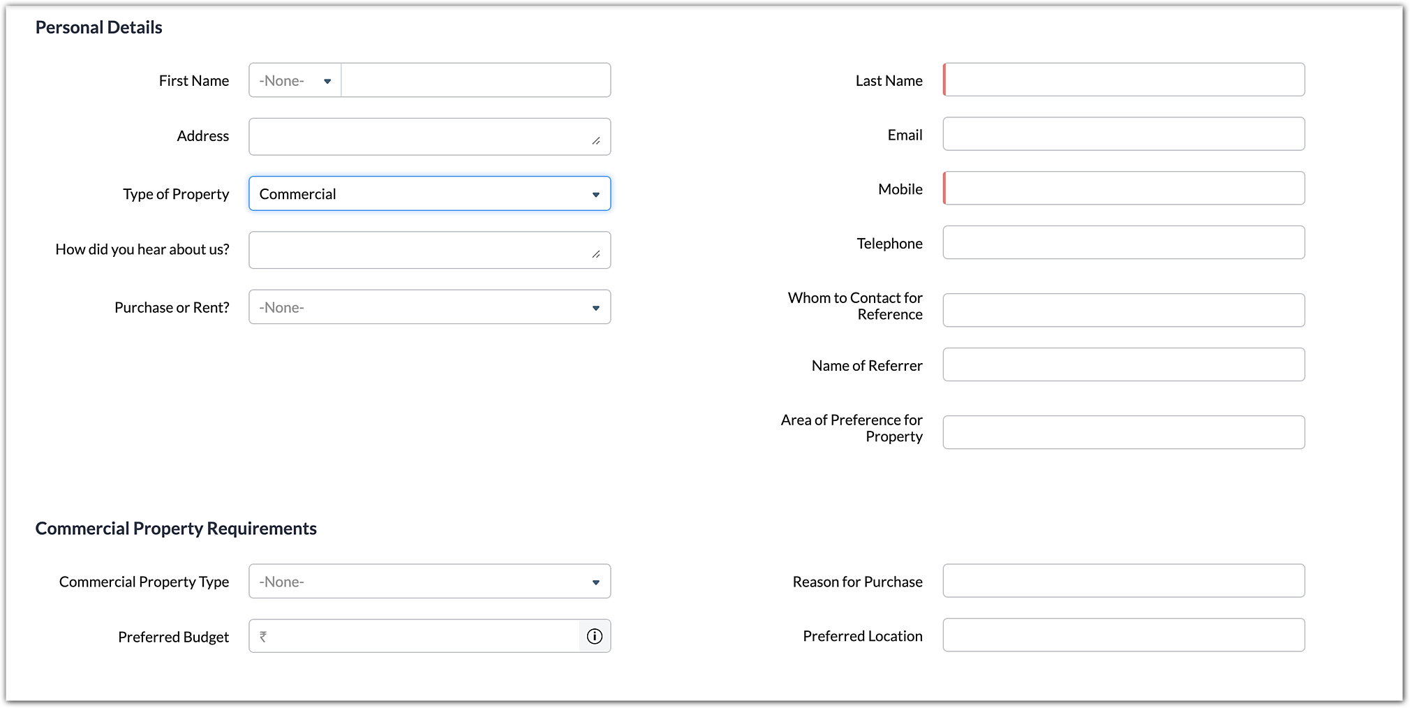 Asta nu înseamnă că am eliminat celelalte câmpuri sau secțiuni, ci că am introdus layouturile condiționale pentru a ascunde/afișa secțiuni sau câmpuri pe baza unei valori introduse într-un câmp anterior (deoarece datele de vânzări sunt adesea interdependente). Selectând Proprietăți comerciale la 'Tip de proprietate' și Programe de Științe la 'Licență în', agentul companiei imobiliare și recruterul de la universitate vor vedea doar câmpurile pentru proprietăți comerciale, respectiv pentru Științe.