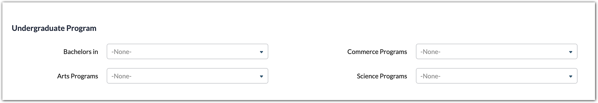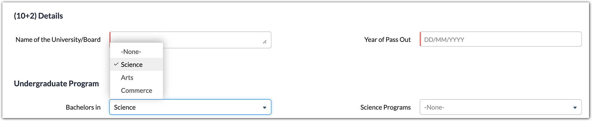 - Sau un coordonator de recrutare care colectează detaliile unui student interesat să aplice la Științe, fiind nevoit să parcurgă și câmpurile de Arte și Comerț.