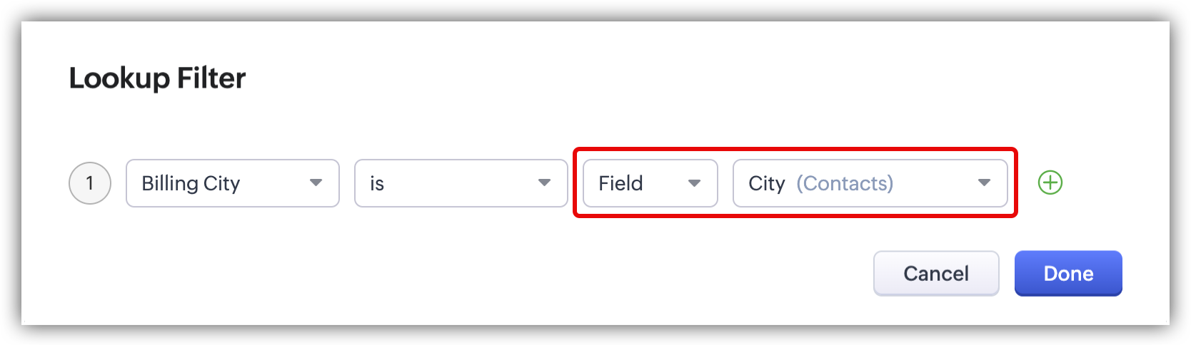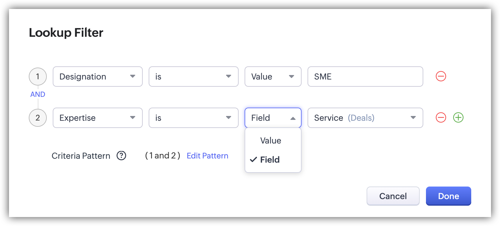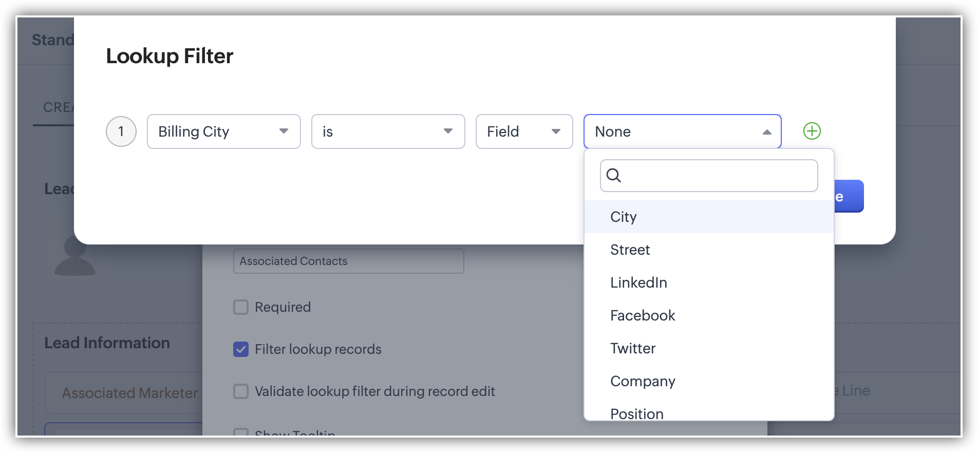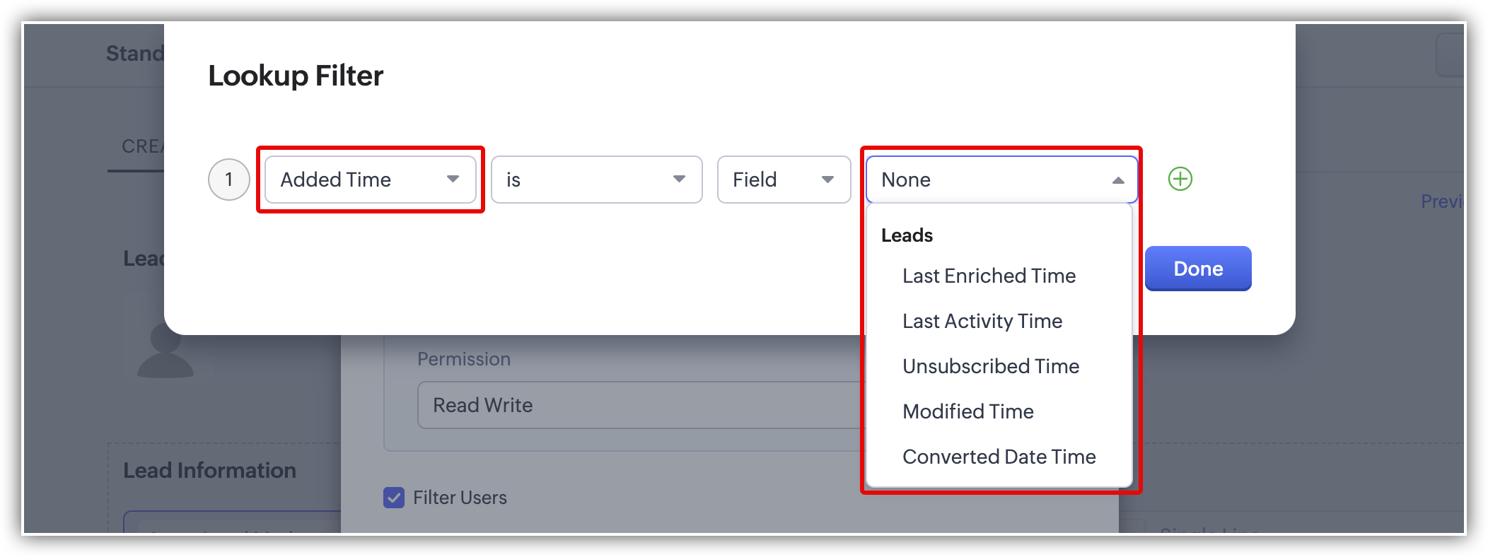 - Pentru filtrele de căutare cu criterii bazate pe câmpuri, câmpurile din modulul curent vor fi de același tip cu câmpul selectat în câmpul de căutare. De exemplu, dacă un câmp de tip Dată sau Dată/Oră precum Added Time din modulul de căutare este selectat pentru filtru, câmpuri similare din modulul părinte precum Last Activity Time, Converted Date Time etc. vor fi listate pentru potrivirea tipului de câmp.
