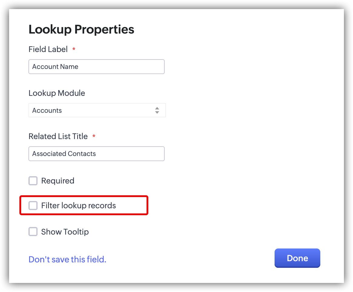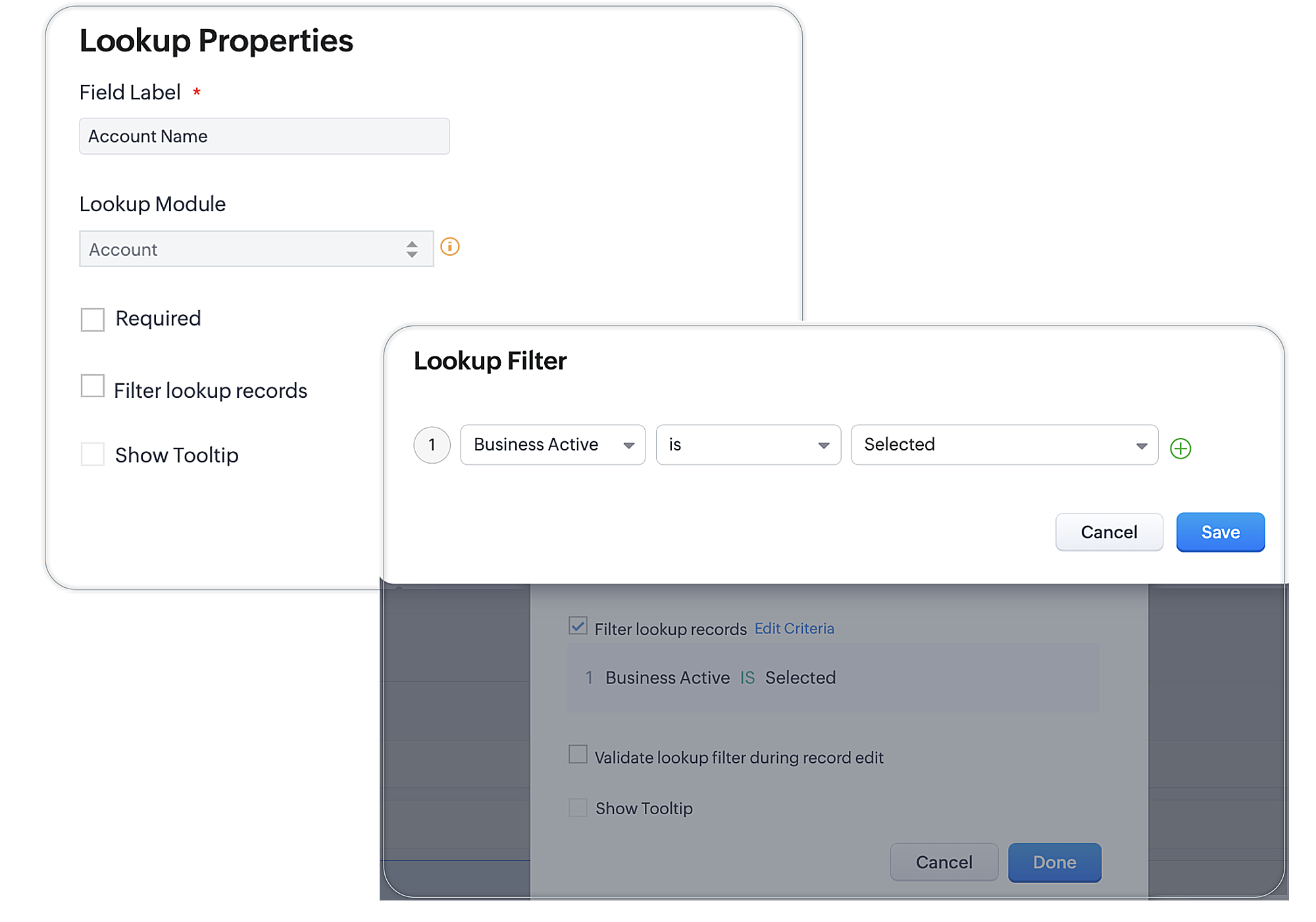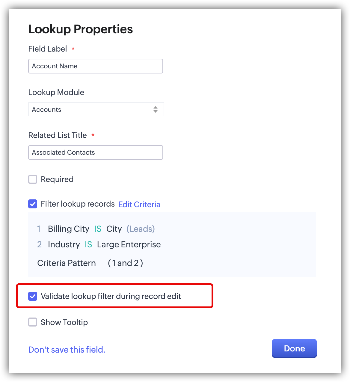 Opțiunea „Validate lookup filter during record edit" în timpul editării înregistrărilor este utilă atunci când valorile sau câmpurile asociate s-au modificat ca urmare a unor actualizări. Permite utilizatorilor să reverifice și să confirme că înregistrările corecte sunt în continuare asociate la editarea înregistrării. - Fă clic pe Done .