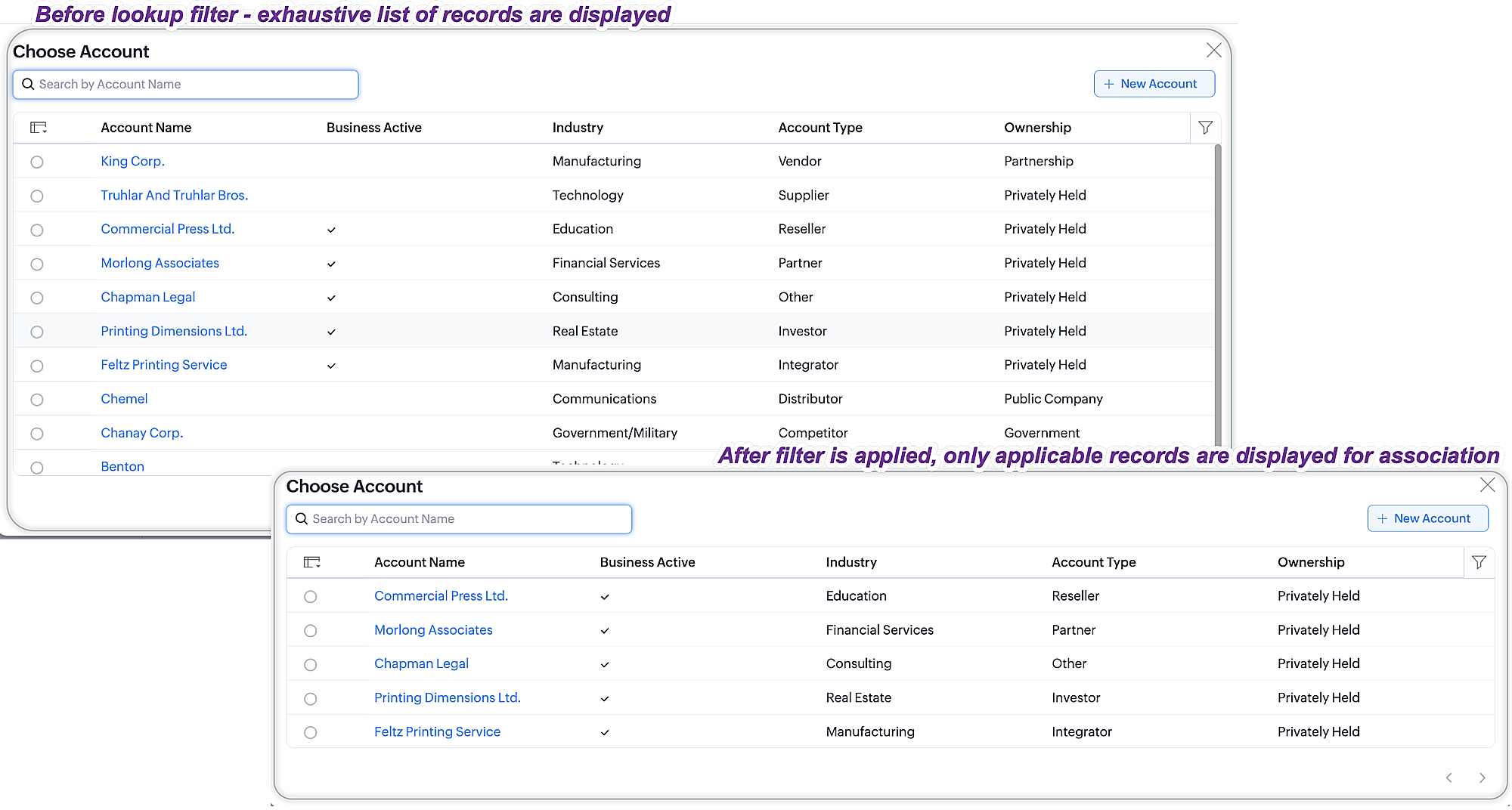 Filtrele de căutare din Zoho CRM ajută la simplificarea selecției datelor, asigurând că utilizatorii pot alege doar înregistrările relevante atunci când asociază date între module. Acest lucru reduce riscul de erori prin filtrarea opțiunilor disponibile pe baza unor criterii specifice.