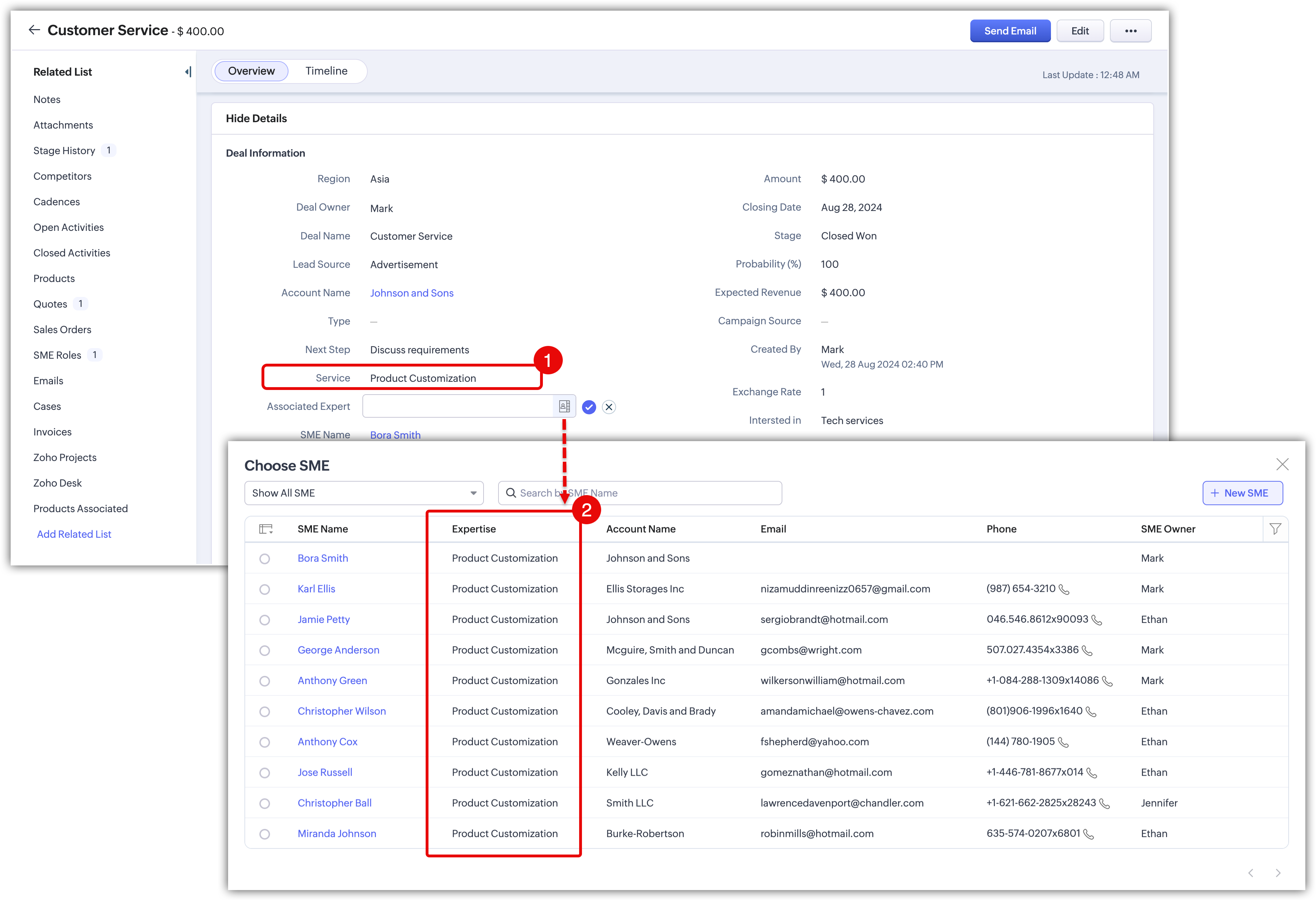 Imaginează-ți acest scenariu: un manager de vânzări finalizează un deal complex și are nevoie să implice un expert în domeniu (SME) pentru suport suplimentar. Câmpul de căutare poate filtra rezultatele dinamic și poate lista experții ale căror competențe corespund cerințelor de servicii ale dealului.
