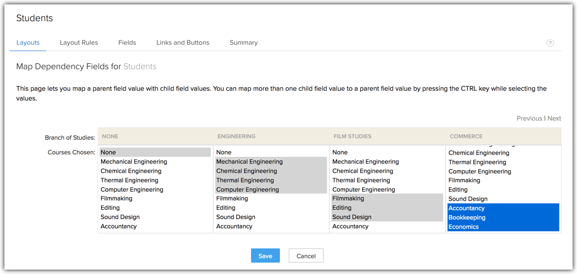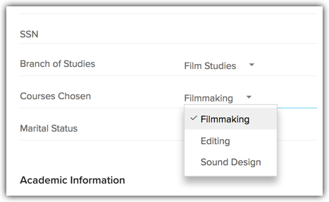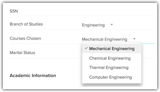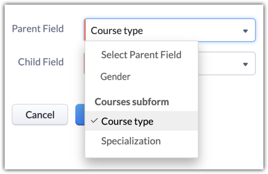 - De exemplu, dacă câmpul părinte este Ramura de studii, selectează Cursurile relevante pentru ramura selectată.