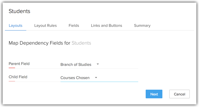 Notă: Câmpurile părinte și copil vor afișa toate câmpurile de tip listă de selecție prezente în layout și subformular. Pentru a mapa dependențele câmpurilor