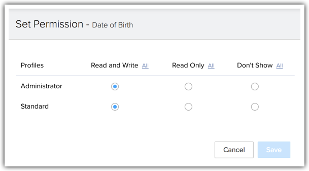 - Setează permisiunile de acces la câmpuri: Poți ascunde câmpurile pentru utilizatorii dintr-un profil specific sau le poți marca ca doar pentru citire.