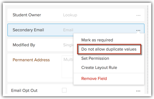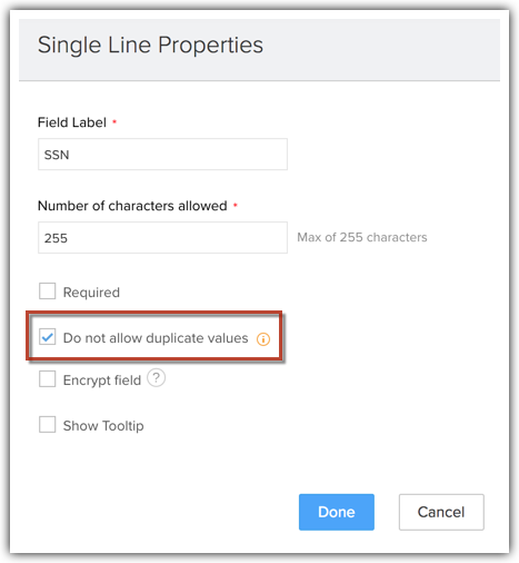 - Odată ce un câmp a fost marcat ca unic, poate dura ceva timp până când Zoho CRM indexează această schimbare în baza de date. Adică, după marcarea unui câmp ca unic, dacă creezi imediat o înregistrare în modul cu aceeași valoare, Zoho CRM s-ar putea să nu recunoască valoarea câmpului unic. Poate permite crearea duplicatului, deoarece modificarea nu a fost încă indexată. Într-un astfel de caz, încearcă din nou după câteva minute.