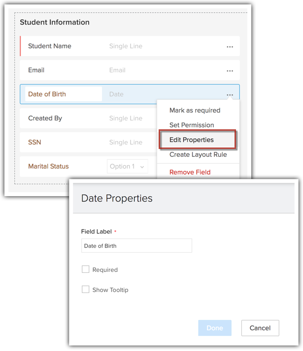 La adăugarea sau editarea unui câmp personalizat, vei putea efectua o serie de acțiuni asupra acestuia. De exemplu, poți edita proprietățile de bază ale unui câmp, îl poți marca ca obligatoriu, îl poți face un câmp unic și altele. Mai jos sunt prezentate diversele setări pentru câmpuri personalizate disponibile în Zoho CRM.