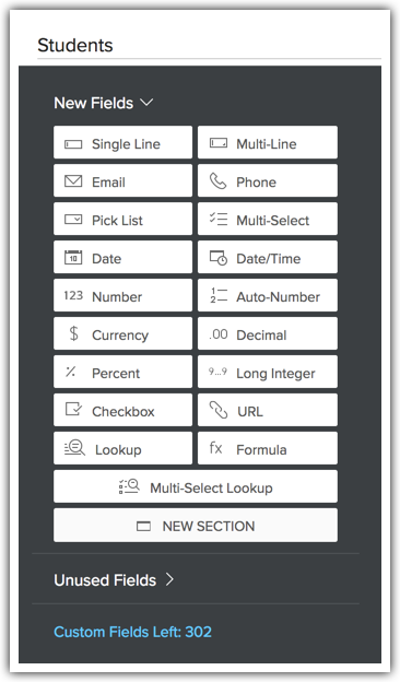 - Când un câmp eliminat se află în secțiunea Câmpuri neutilizate, acesta face în continuare parte din baza de date. Prin urmare, numărul total de câmpuri permise pentru ediția ta Zoho CRM include și câmpurile din secțiunea Câmpuri neutilizate.