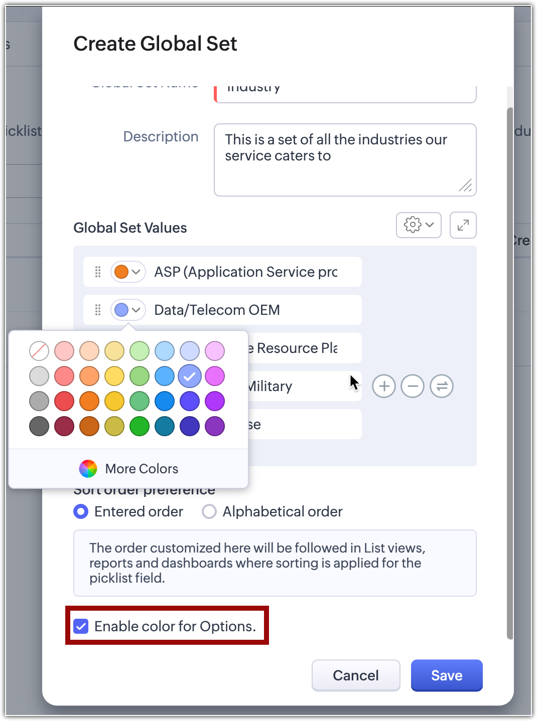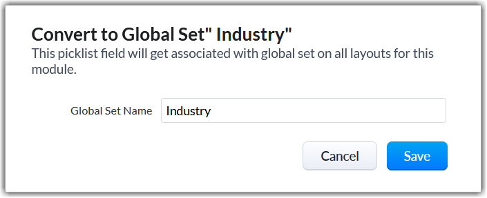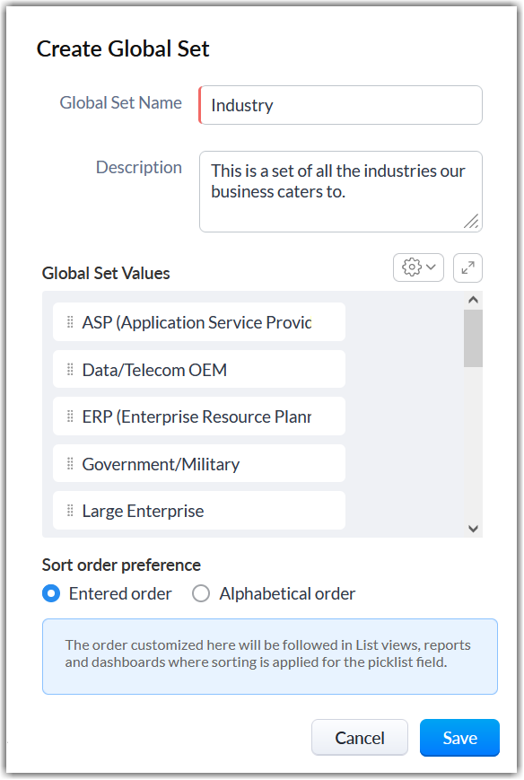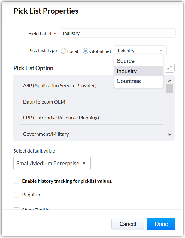 - Următoarele câmpuri de listă de selecție nu pot fi asociate cu seturi globale:ModulNumele listei de selecțieLeadsLead Status, SalutationContactsSalutationDealsStageTasksStatus, PriorityCallsOutgoing Call Status, Call TypeQuotesStage, CarrierPurchase OrdersStatus, CarrierSales OrdersStatus, CarrierInvoicesStatus, CarrierVendorsGL AccountCasesStatusSolutionsStatusAppointmentsAppointment StatusServicesService Status