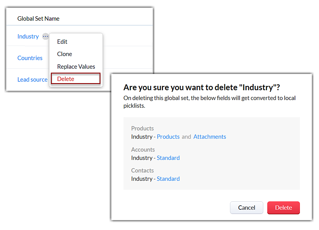 - Ștergerea unei valori din lista de selecție dintr-un set global va elimina acea valoare din listele de selecție asociate. Nu va elimina acea valoare din înregistrările existente sau din alte locuri din CRM, cum ar fi regulile de flux de lucru, criteriile, rapoartele etc.