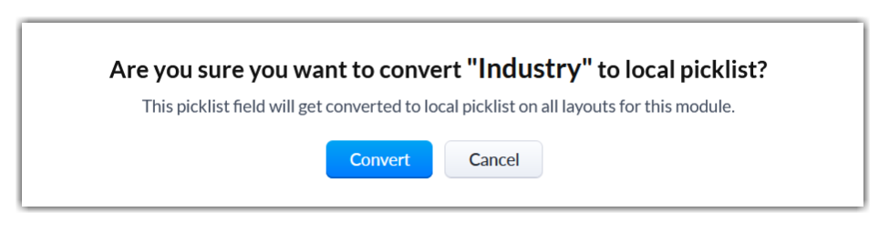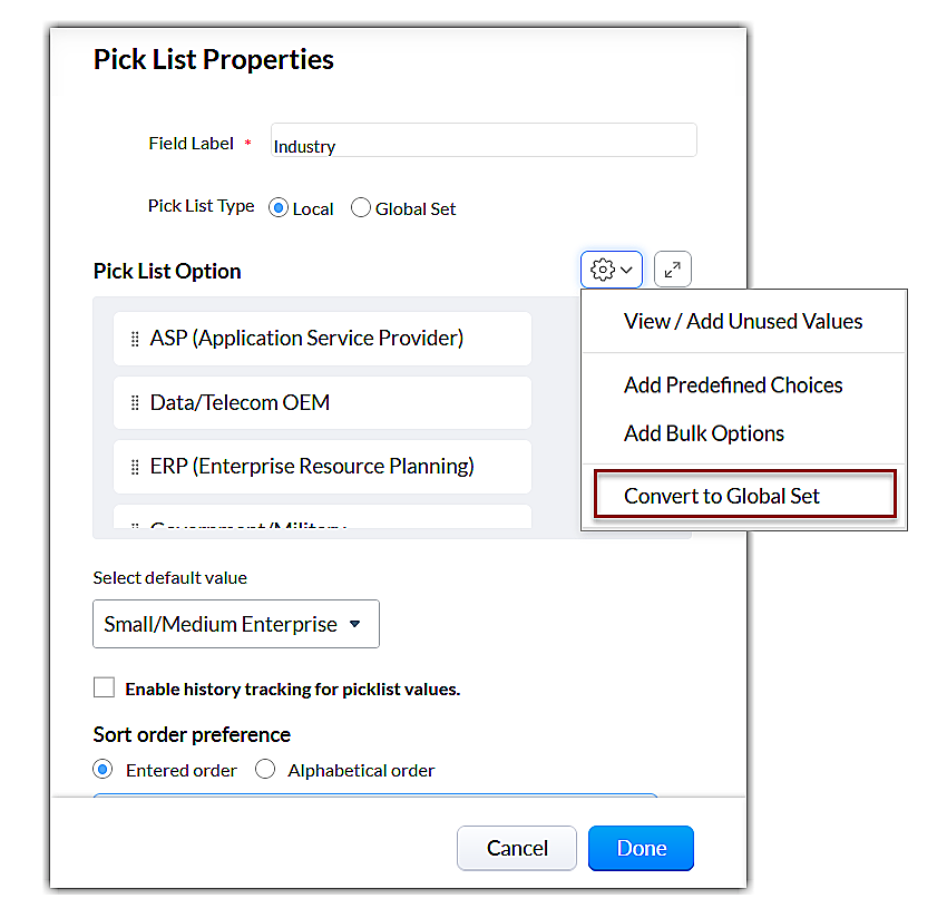 - În pagina Pick List Properties , apasă pictograma gear și selectează Convert to Global Set.