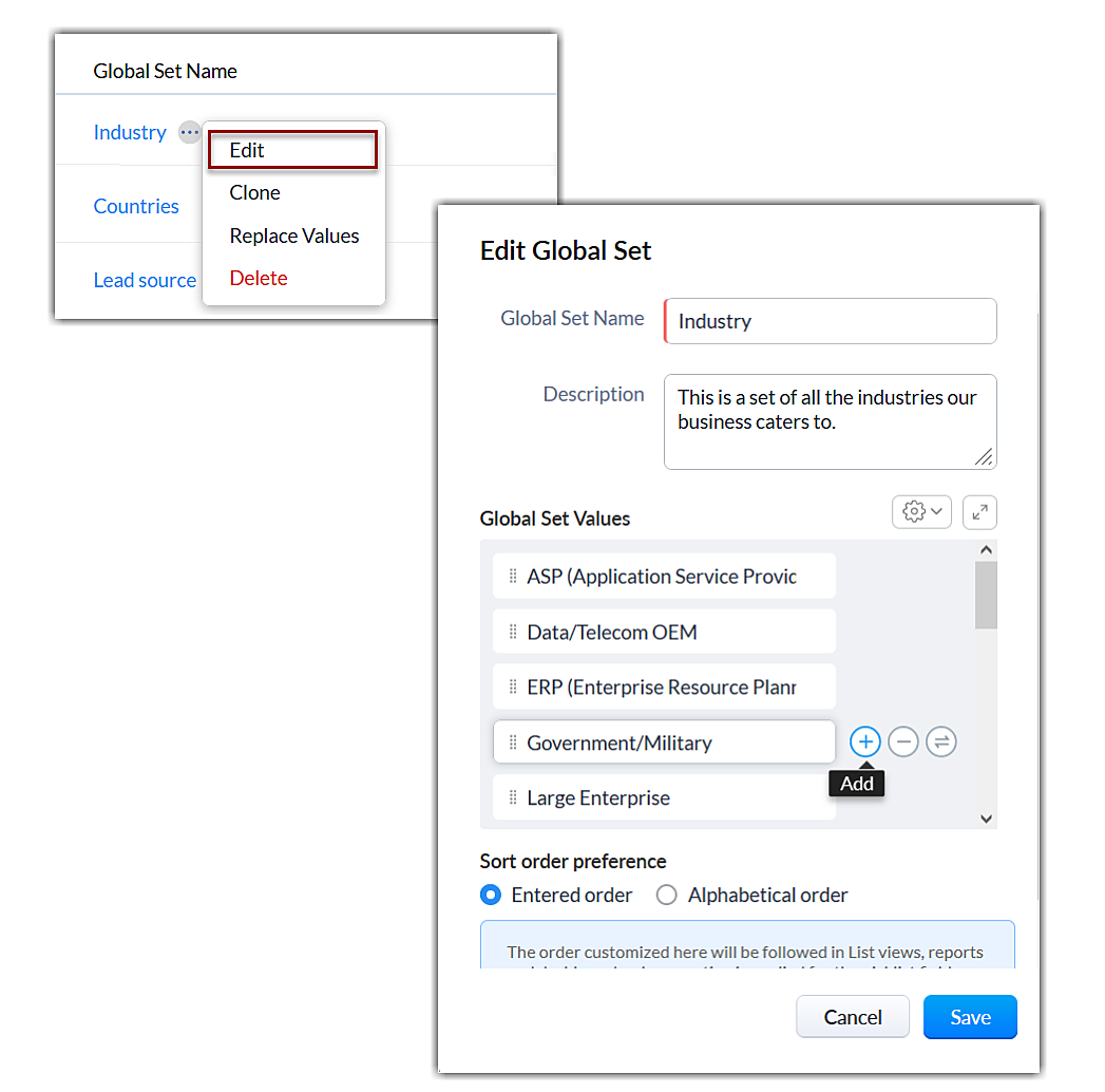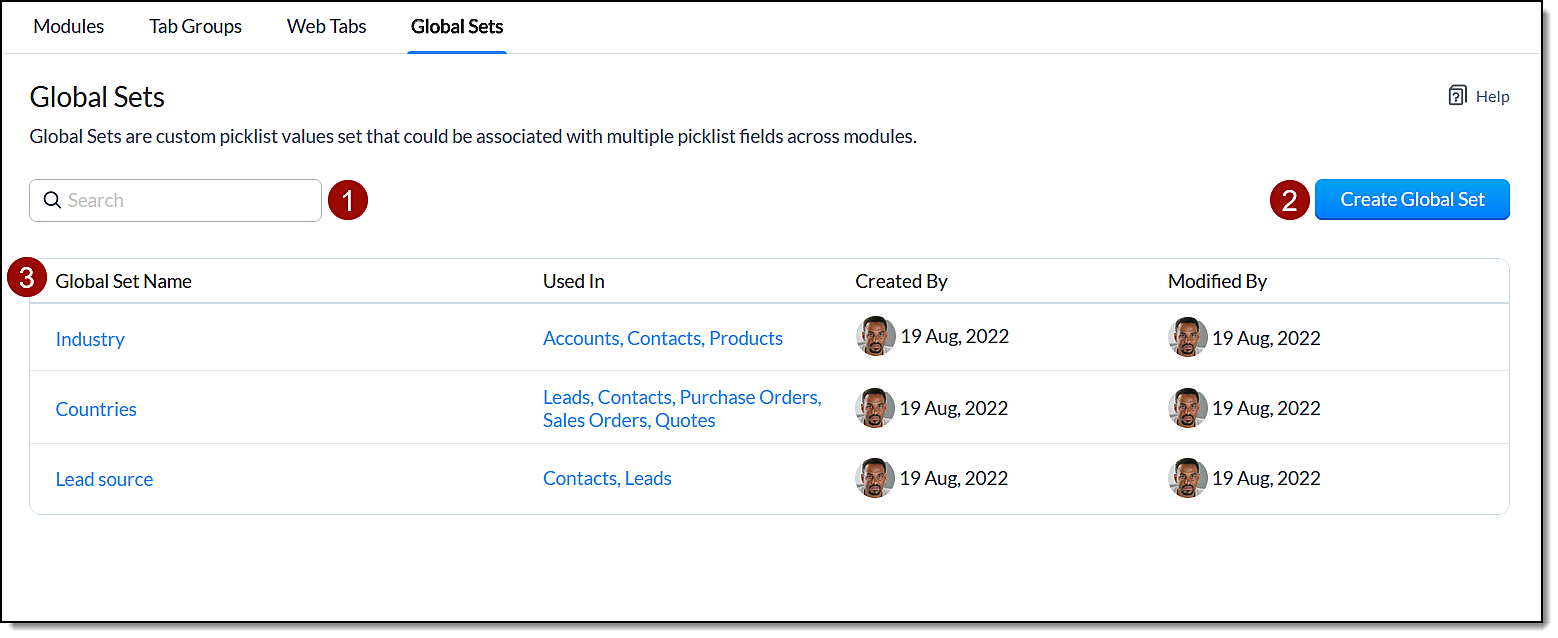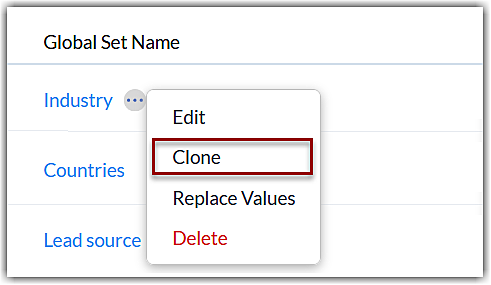 Seturile globale din Zoho CRM te ajută să gestionezi cu ușurință valorile listelor de selecție care se repetă în diferite module. Pentru o prezentare generală a acestei funcționalități, vezi Prezentare generală a seturilor globale.