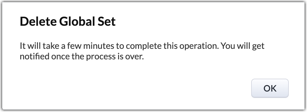 - În fereastra popup Are you sure you want to delete <Global set name>?, apasă Delete. Dacă listele de selecție sunt asociate cu acel set global, ele vor fi afișate în această fereastră popup.
