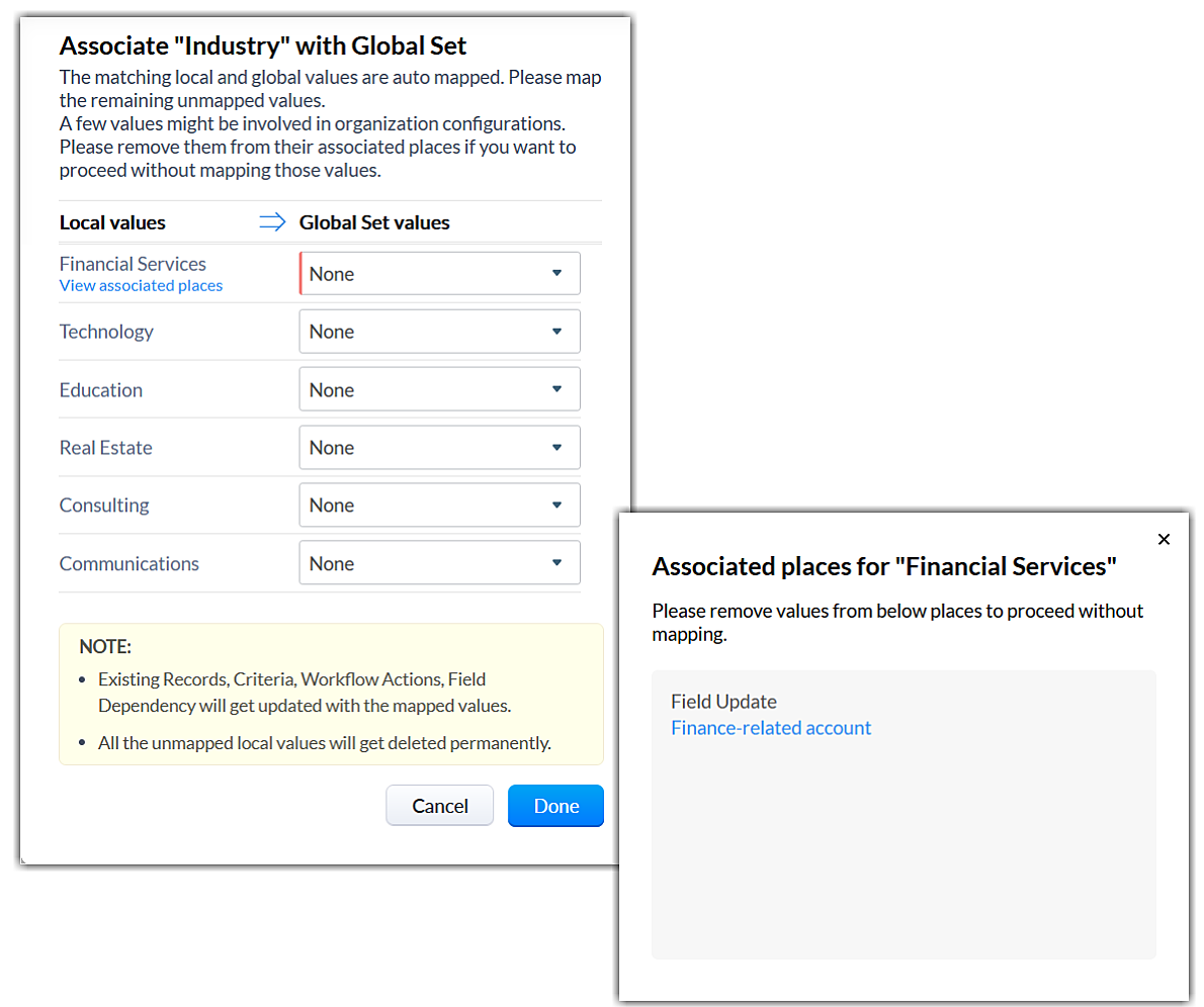 - Acest lucru este obligatoriu dacă valoarea este folosită în alte părți ale CRM-ului, cum ar fi actualizări de câmpuri, reguli de flux de lucru, criterii etc. Aceste valori ale listei de selecție vor avea un link View associated places pentru a vedea acele locuri. Mapează valorile și apasă Done.