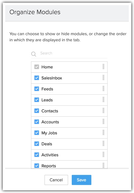 Opțiunea de organizare a filelor permite organizațiilor să afișeze doar numărul relevant de module și să le ascundă pe cele nedorite. De exemplu, o organizație educațională care folosește Zoho CRM ar putea să nu aibă nevoie de Quotes sau Invoices, astfel încât aceste module pot fi ascunse. Poți schimba și ordinea modulelor mutându-le în sus sau în jos în listă.