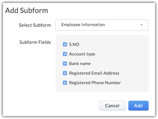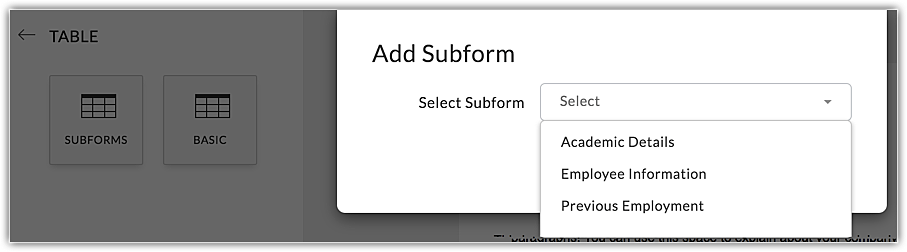 În pagina Add Subform, selectează un Subform din lista derulantă.