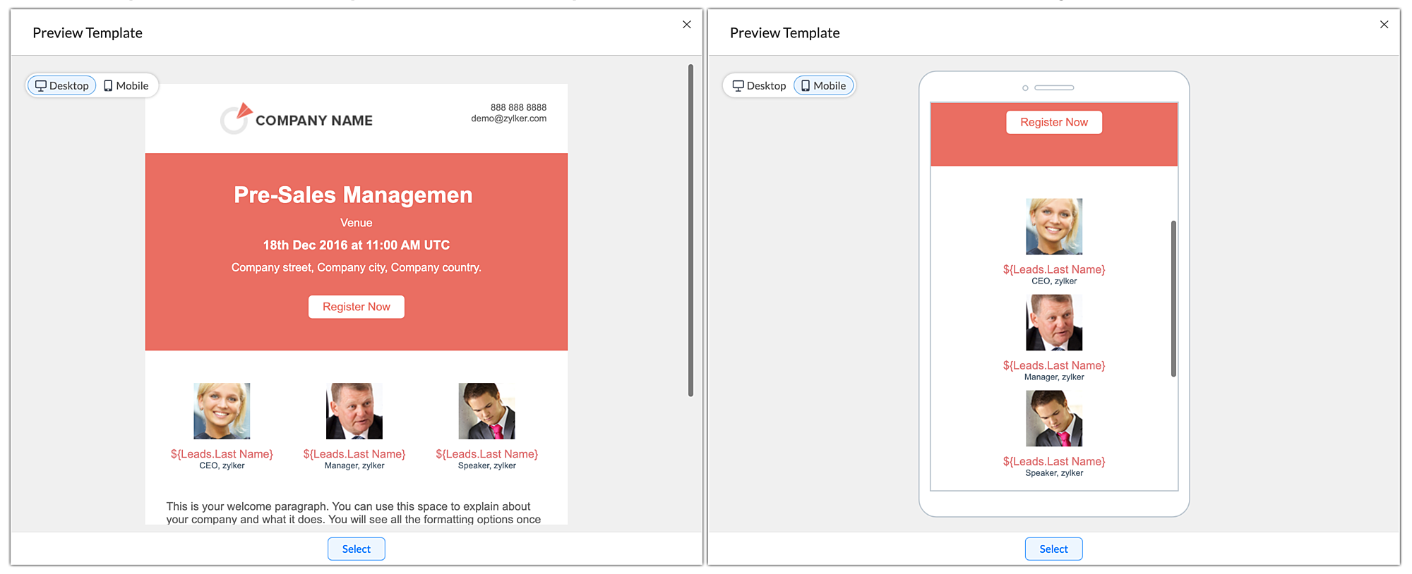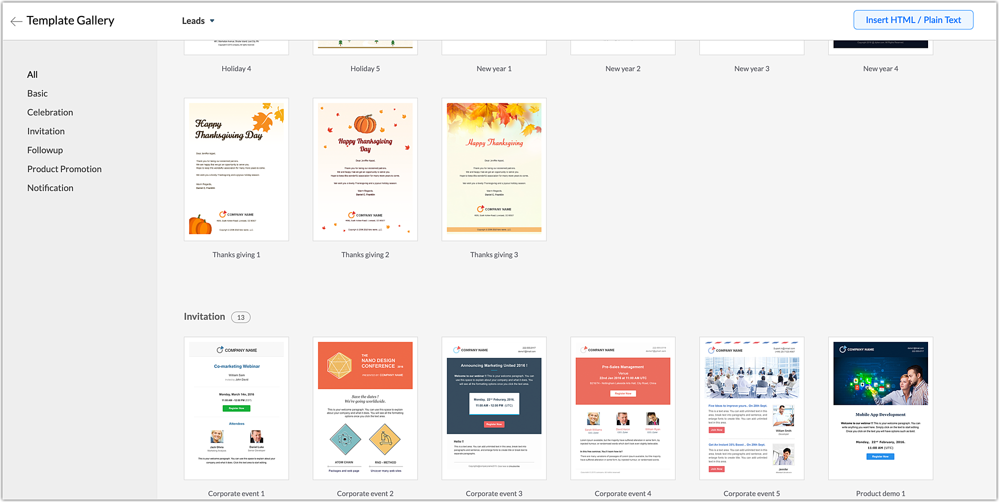 - Șabloanele de Email sunt specifice modulului. Sunt create pentru un modul specific. De exemplu, poți crea un șablon pentru lead-uri sau contacte. Când trimiți email-uri către lead-uri, vor fi disponibile doar șabloanele create pentru modulul de lead-uri. De asemenea, dacă creezi un șablon de email pentru trimiterea email-urilor către lead-uri, nu îmbina câmpurile legate de contacte și invers.