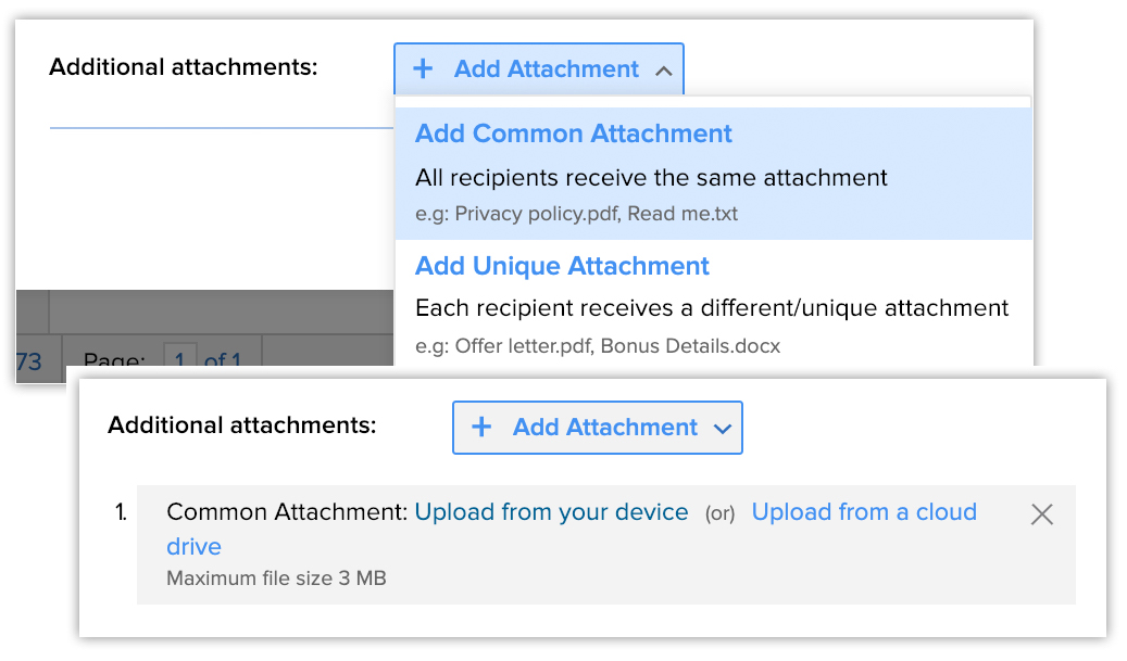 - Common Attachment - Atașamentul pe care îl adaugi aici de pe dispozitivul tău sau din Zoho Docs va fi același pentru toți destinatarii.