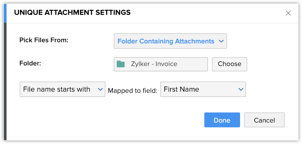 - Folder containing attachments - Aceasta îți permite să atașezi fișierul dintr-un folder prezent în Zoho Docs. Să zicem că ai un folder numit Zylker - Invoice în Zoho Docs, care conține toate copiile facturilor cu numele fișierului identic cu Prenumele Contactului. Poți alege să mapezi fișierul corespunzător la contact din lista derulantă. În acest caz, alege File name starts with și sub lista derulantă Mapped to field alege First Name.