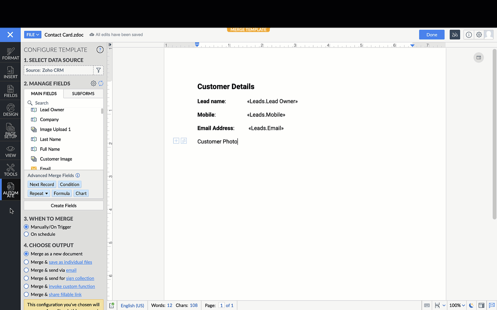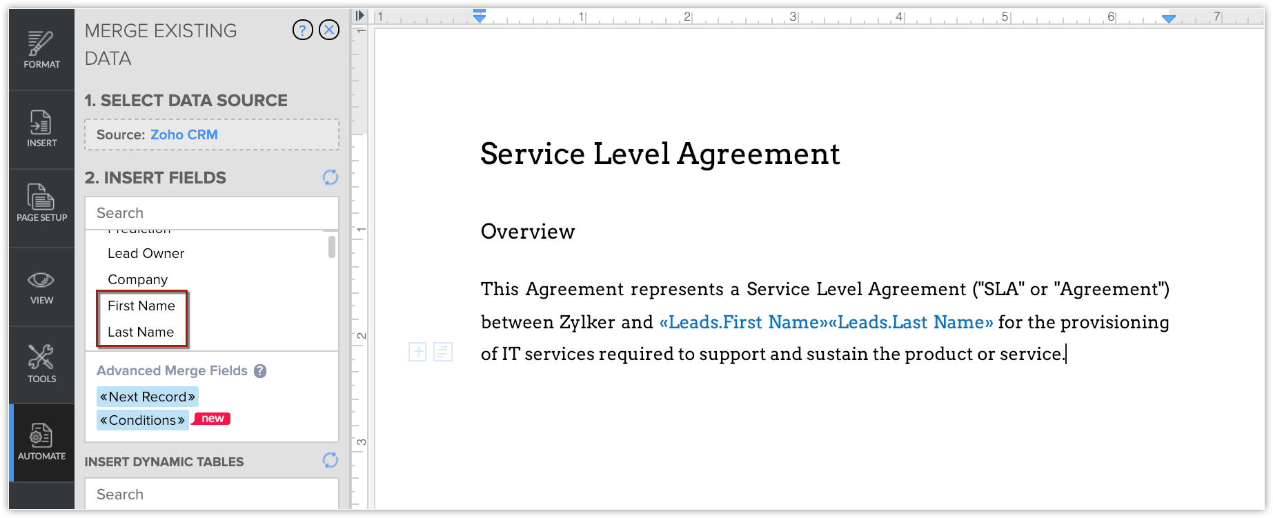 Un document va fi deschis în Zoho Writer. - Selectează Merge Fields din secțiunea Insert Fields din fila AUTOMATE.