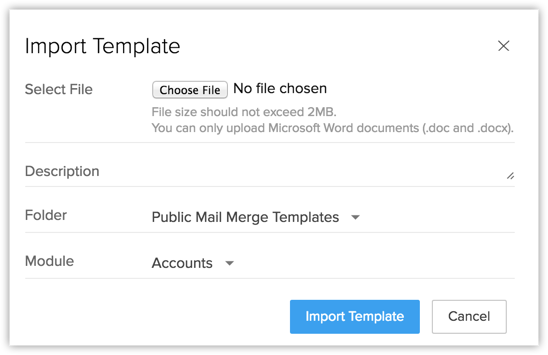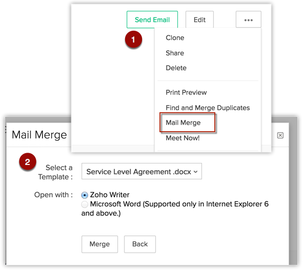Șabloanele Mail Merge pot fi create și în Microsoft Word și poți importa acele șabloane în Zoho CRM. Pentru a folosi această funcționalitate, trebuie să achiziționezi plug-in-ul Zoho CRM pentru Microsoft Office. Reține că, pentru îmbinarea datelor, această funcție este suportată doar în Internet Explorer 6 și versiuni superioare. Vezi și Zoho CRM Plug-in for MS Office