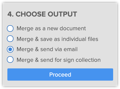 Vei fi redirecționat către șablonul din Zoho Writer. Poți edita șablonul dacă este necesar. - În stânga, sub secțiunea Choose Output, selectează Merge & send via email și fă clic pe Proceed.