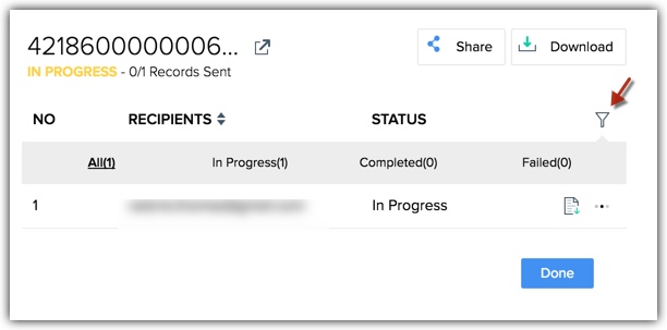 În schimb, în Mail Merge Logs, vei vedea starea unui anumit șablon mail merge care a fost trimis unei persoane sau mai multor persoane. De exemplu, ai trimis un șablon numit Service Level Agreement la 5 persoane. Mail Merge Logs va arăta starea acelui șablon particular și starea livrării pentru fiecare destinatar căruia i-a fost trimis.