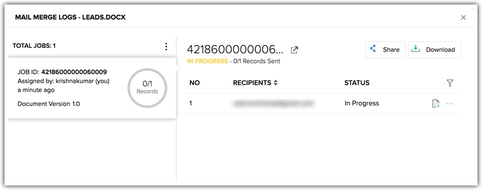În orice moment, poți urmări starea documentelor mail merge trimise folosind jurnalele Mail Merge. Jurnalele îți vor oferi detalii precum "sarcina" în curs, cine trimite emailul, versiunea documentului și așa mai departe.