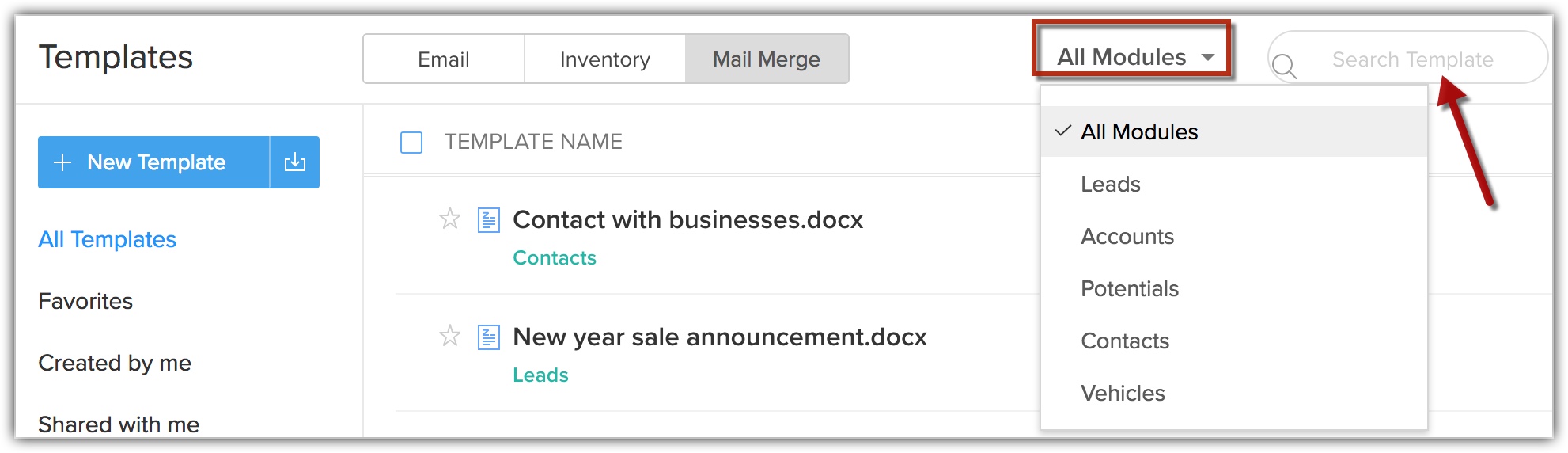 Câmpurile de îmbinare din șablon se vor baza pe modulul pe care îl selectezi. Poți crea șabloane mail merge atât pentru modulele generate de sistem, cât și pentru modulele personalizate. - Introdu Template Name.