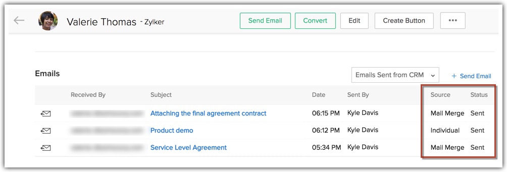 Odată ce ai trimis documentele mail merge prin email, acestea pot fi urmărite sub Emails Related List al înregistrărilor asociate (lead-uri, contacte etc). Vei verifica această listă asociată pentru a vedea lista emailurilor pe care le-ai trimis unui anumit lead/contact și starea lor. Emailurile Mail Merge vor apărea și în această listă asociată.