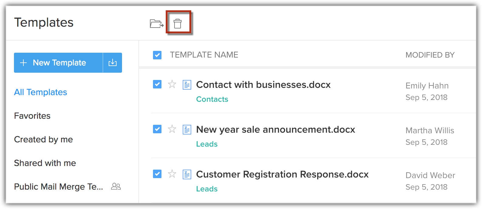 Odată ce ai creat și salvat șabloanele mail merge în Zoho CRM, poți îmbina documentele cu înregistrările CRM și le poți trimite prin email clienților doriți oricând. Următoarele trebuie specificate pentru a trimite prin email documentul îmbinat.