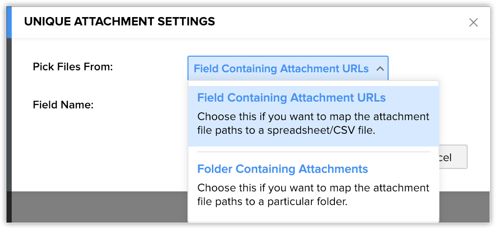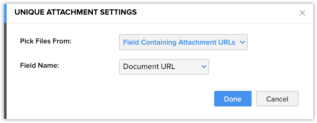 - Field containing Attachment URLs - Dacă URL-ul unui fișier este prezent într-un câmp din Zoho CRM, poți alege câmpul corespunzător și fișierul va fi adăugat ca atașament.