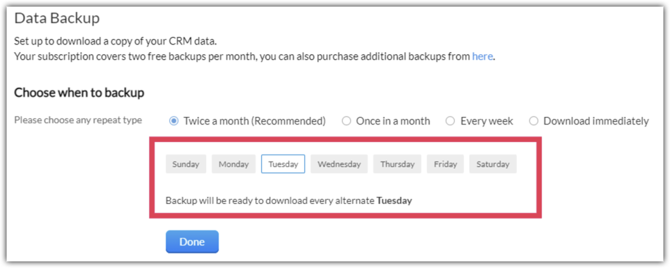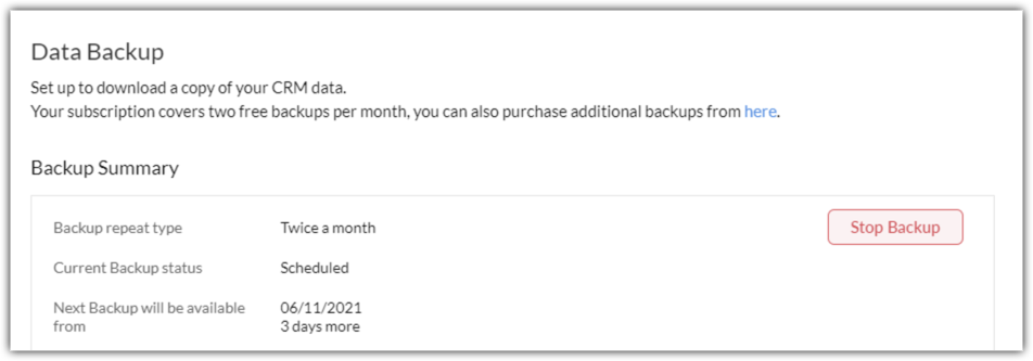 6. Am programat un backup de date în Zoho CRM, dar nu văd opțiunea de descărcare a datelor, ci doar data următorului backup. Ce s-a întâmplat cu backup-ul pe care l-am programat?