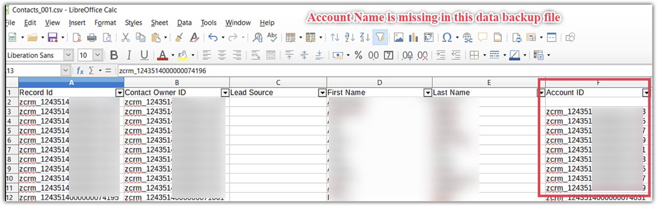 7. În fișierul de backup, câmpul Account Name lipsește pentru modulul Contacts și este afișat doar Account ID. De ce?